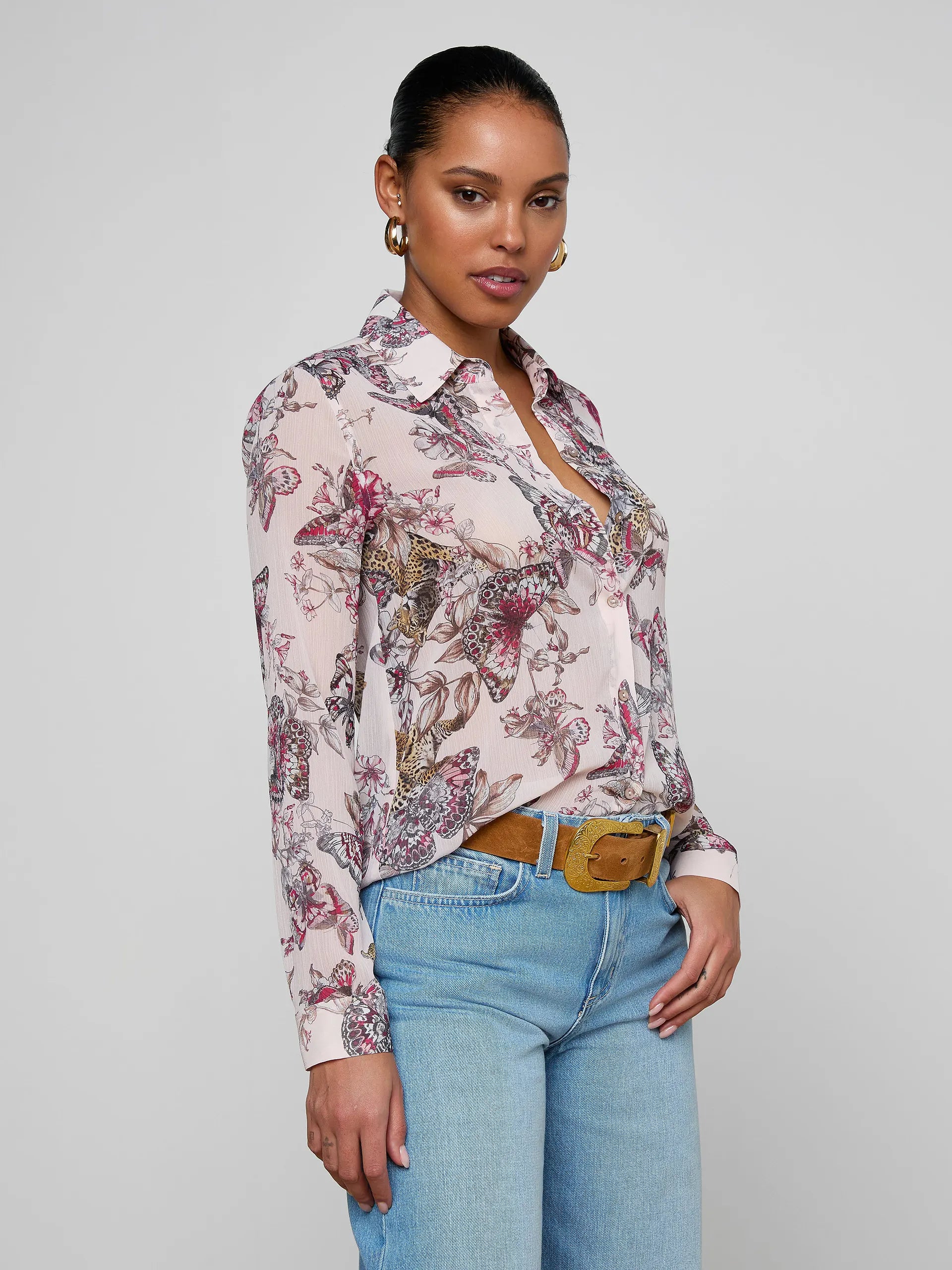 Notre chemise à manches longues et coupe décontractée est de retour avec un imprimé papillon jungle, à la fois romantique et sauvage. Confectionnée dans une mousseline de polyester légère et transparente avec un effet froissé subtil, la chemise Laurent est parfaite pour voyager, à superposer sur une robe de jour ou à associer à votre jean préféré.