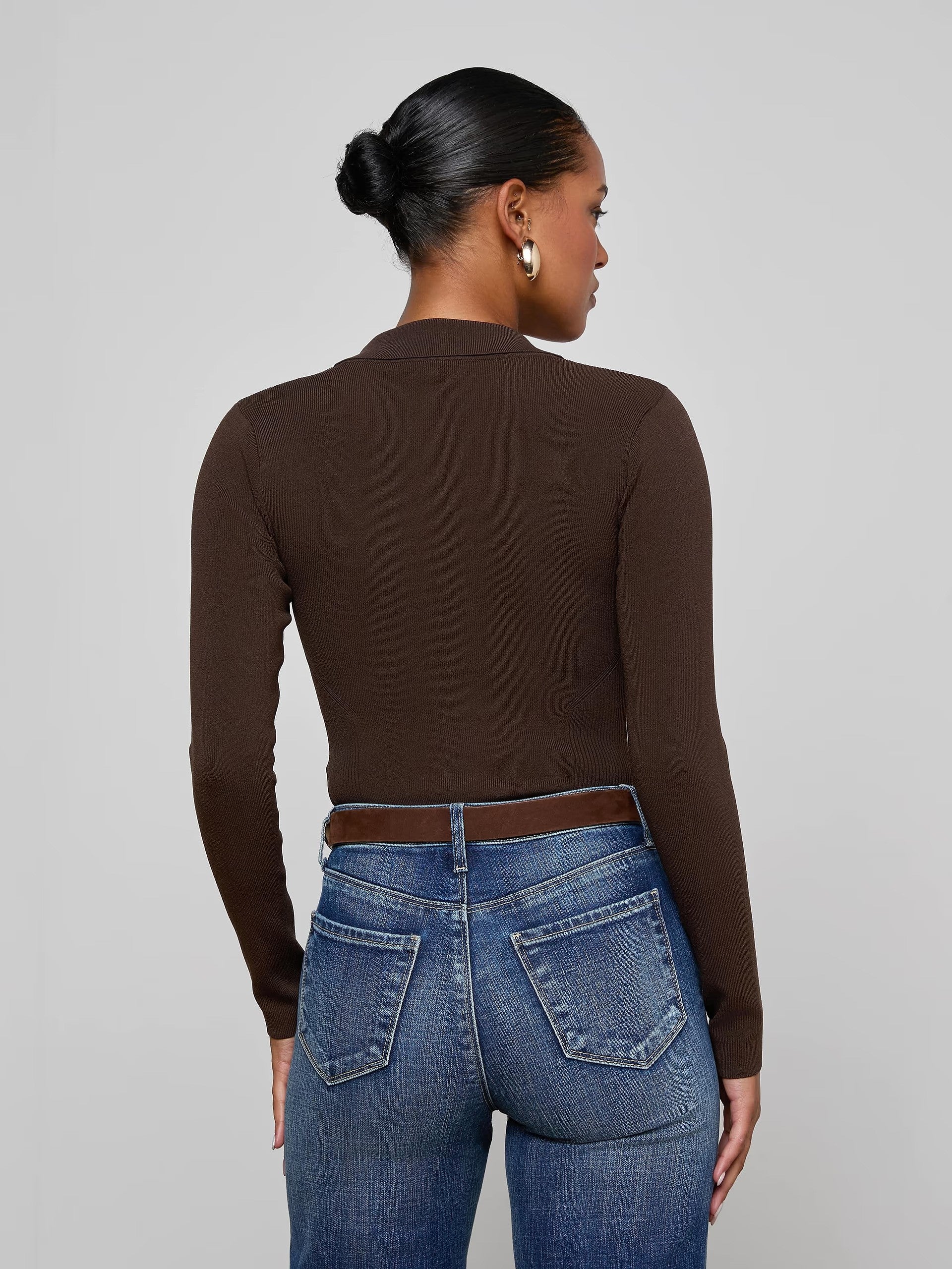 Le polo à manches longues sous forme de body. Le modèle Elisabetta présente un décolleté en V profond, un col pointu et une patte de boutonnage à boutons-pression pour une touche d'élégance. Conçu dans un tricot côtelé extensible, il offre une coupe fluide et ajustée qui se superpose parfaitement sous un jean, une jupe ou un tailleur. De retour en marron chocolat.