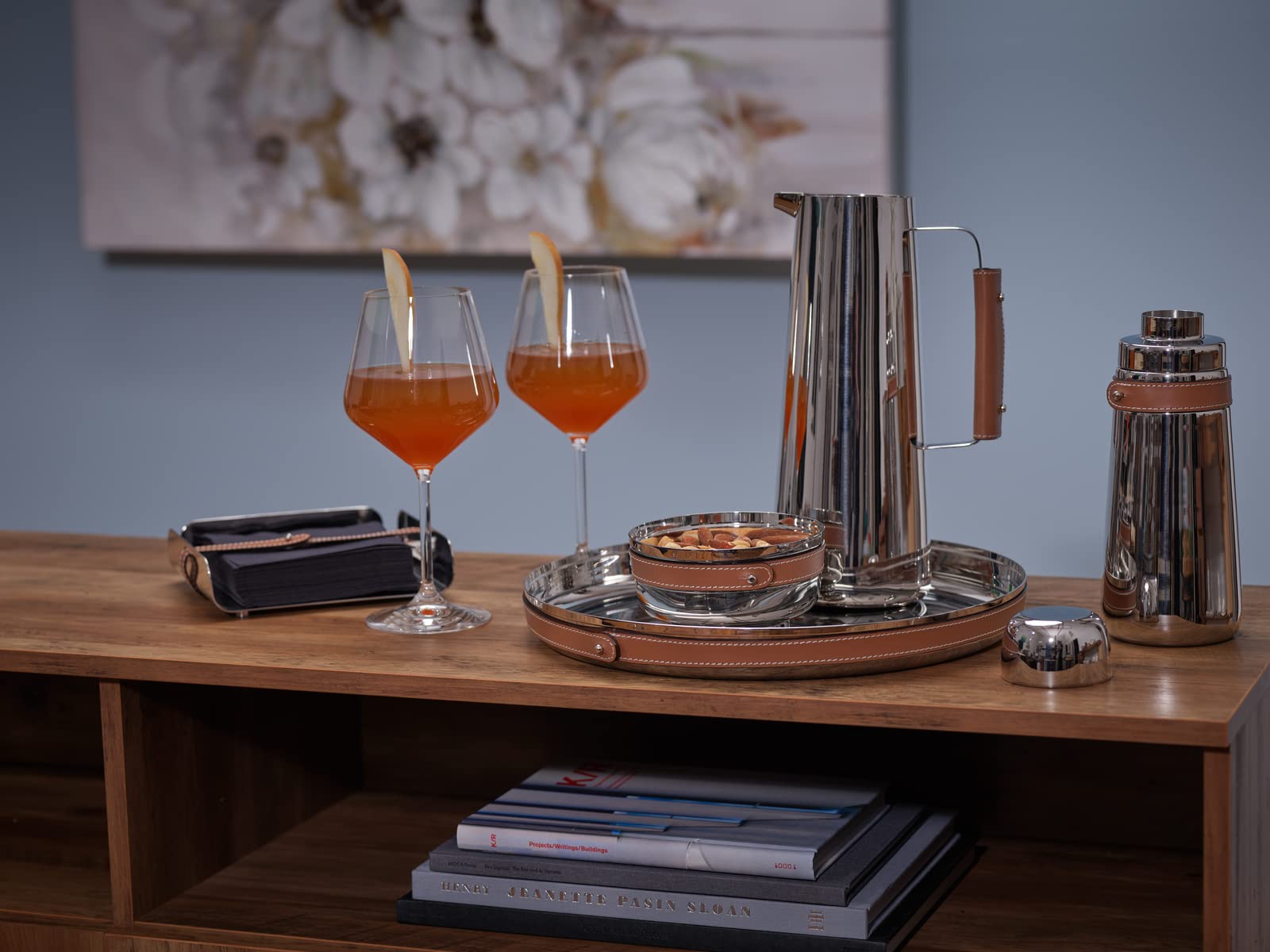 Collection élégante et moderne d'accessoires de bar en acier inoxydable, Tahoe allie une finition brillante et un cuir brun riche pour un design remarquablement raffiné. Présentez vos serviettes à cocktail avec style grâce au porte-serviettes Tahoe. Avec ses trois côtés surélevés et son bord en cuir autour du corps du porte-serviettes pour maintenir les serviettes en place, vous pouvez facilement retirer une serviette lorsque vous en avez besoin en la faisant glisser par le bord ouvert.