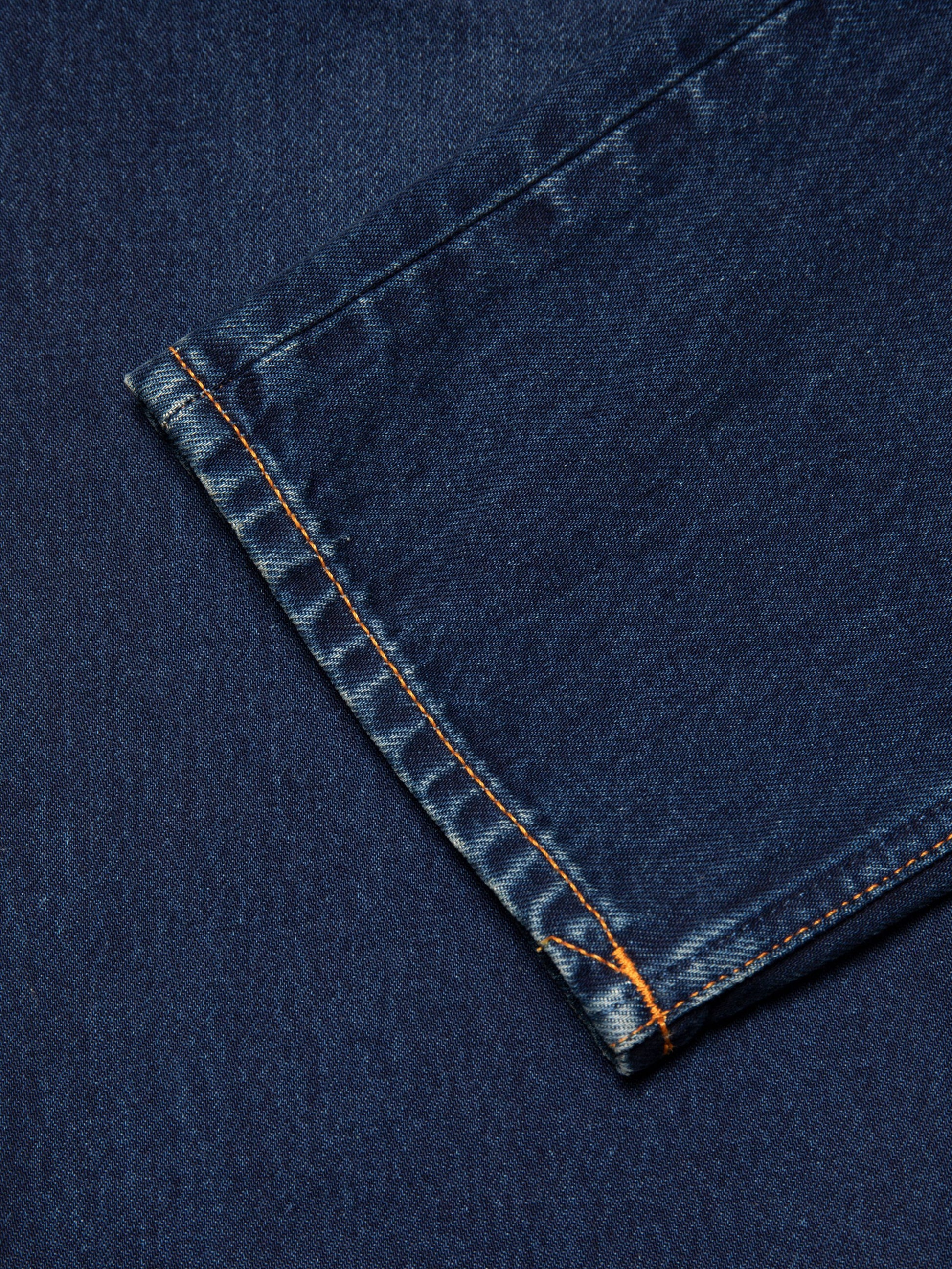Jean de coupe régulière à jambe fuselée, délavé dans des tons indigo foncé profonds, avec de subtiles abrasions et des marques d'usure légèrement contrastées. Le denim utilisé pour ces jeans est fabriqué de manière un peu spéciale : les fils de chaîne sont teints dans un ton indigo intense et, après le tissage, l'ensemble du denim est à nouveau teint en surface avec de l'indigo, ce qui approfondit encore la teinte. C'est cette teinture spéciale du denim qui donne à ces jeans leur teinte exceptionnelle, semblable à celle de l'encre.