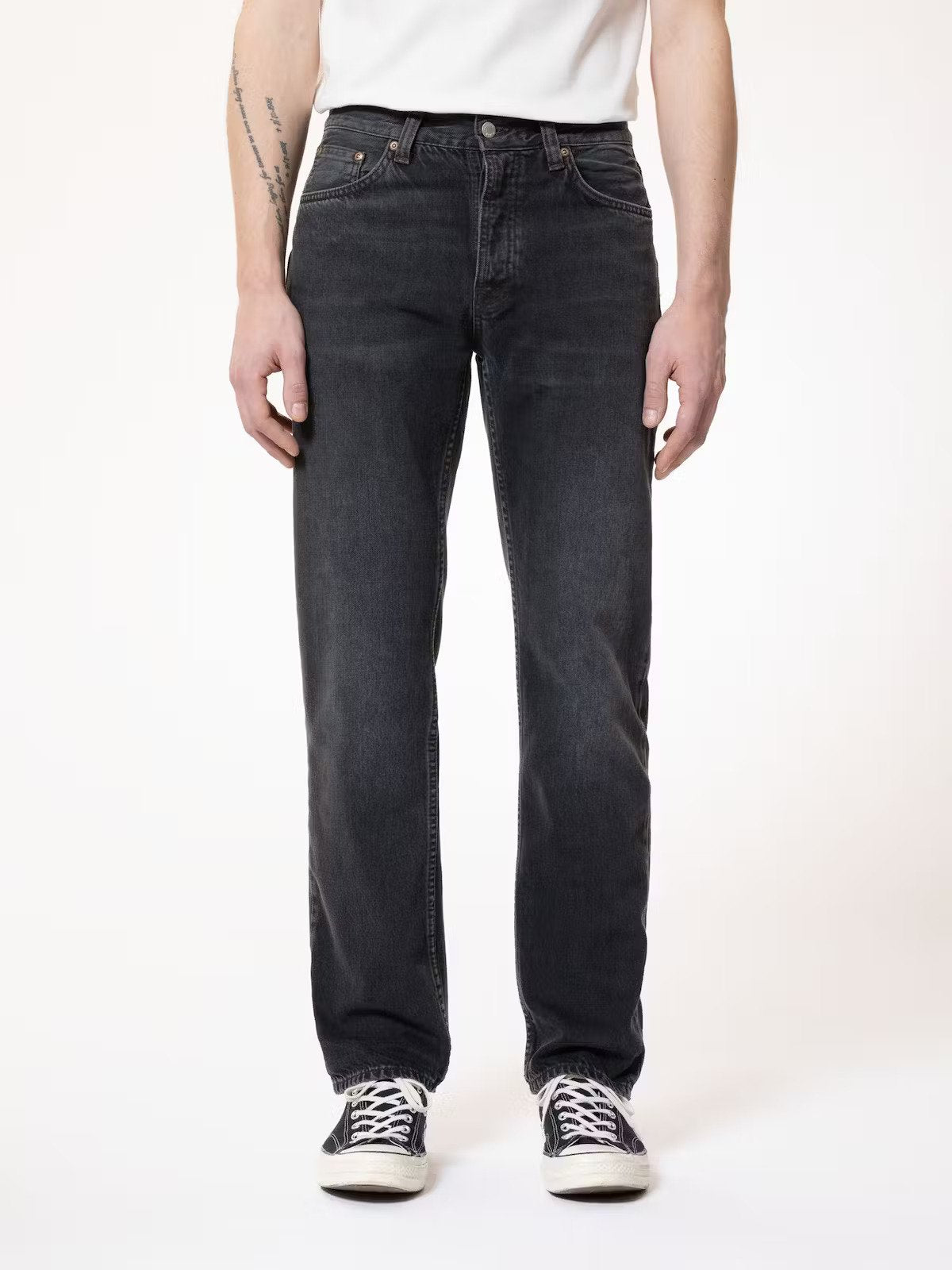 Une nouvelle coupe régulière avec une jambe droite et un lavage noir lisse et vintage. Fabriqué en coton biologique rigide.