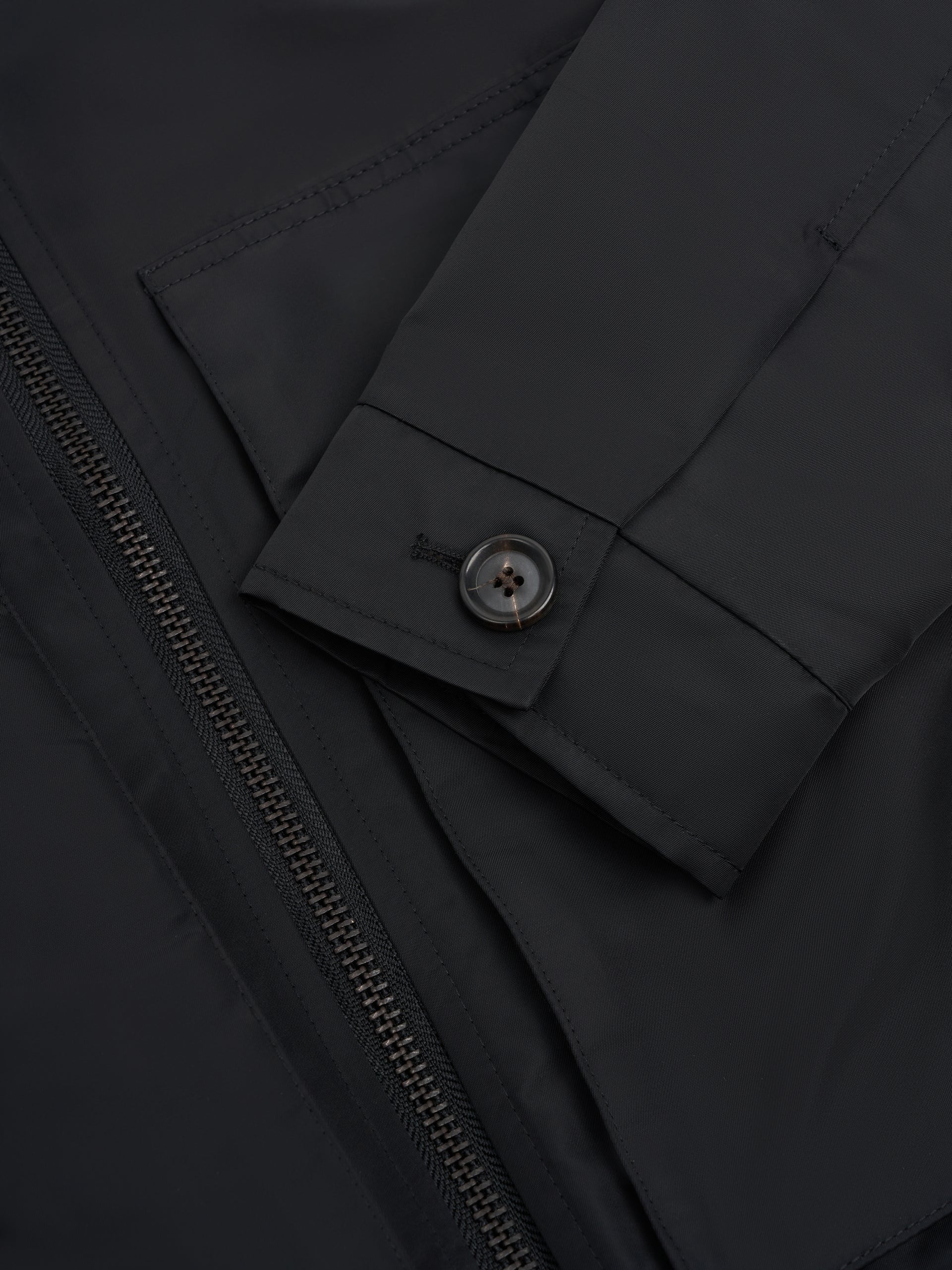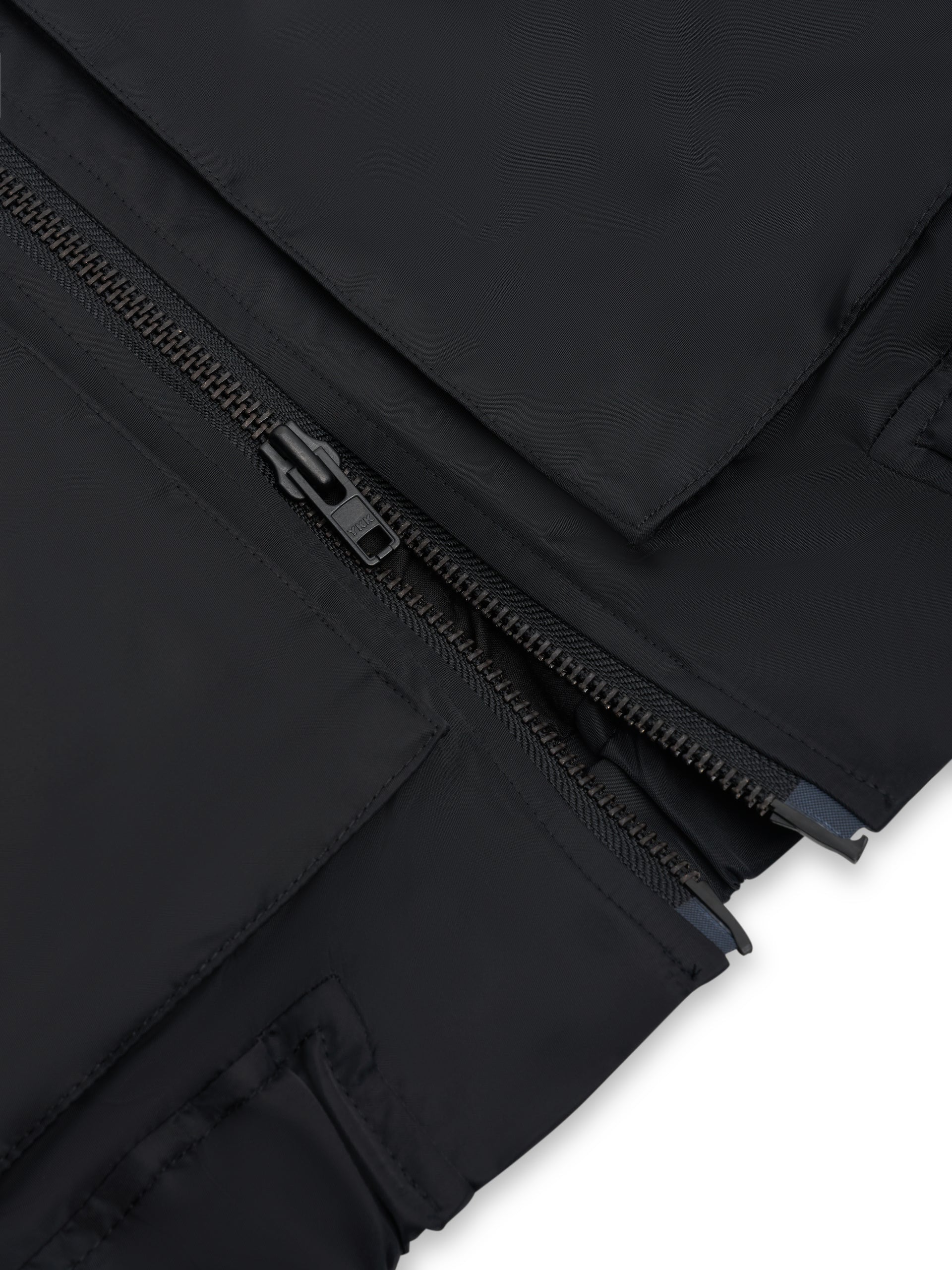 Blouson aviateur classique pour homme, avec col rabattu, confectionné dans un tissu polyamide recyclé déperlant et doté de deux grandes poches plaquées sur le devant. La fermeture à double zip sur le devant et les poignets boutonnés viennent compléter cette silhouette urbaine moderne.