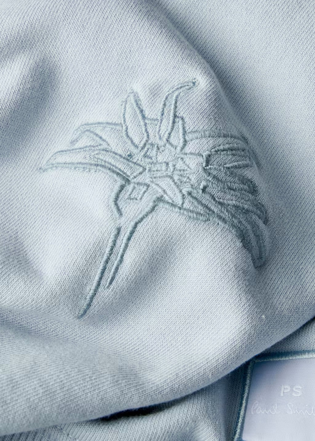 Confectionné en jersey de coton biologique bouclette 100%, ce sweatshirt bleu clair présente un design à col zippé avec col pointu. Teint à l'aide de colorants naturels dérivés d'aliments et de plantes botaniques, ce sweatshirt est fini avec un motif 'Edelweiss' brodé sur la manche.