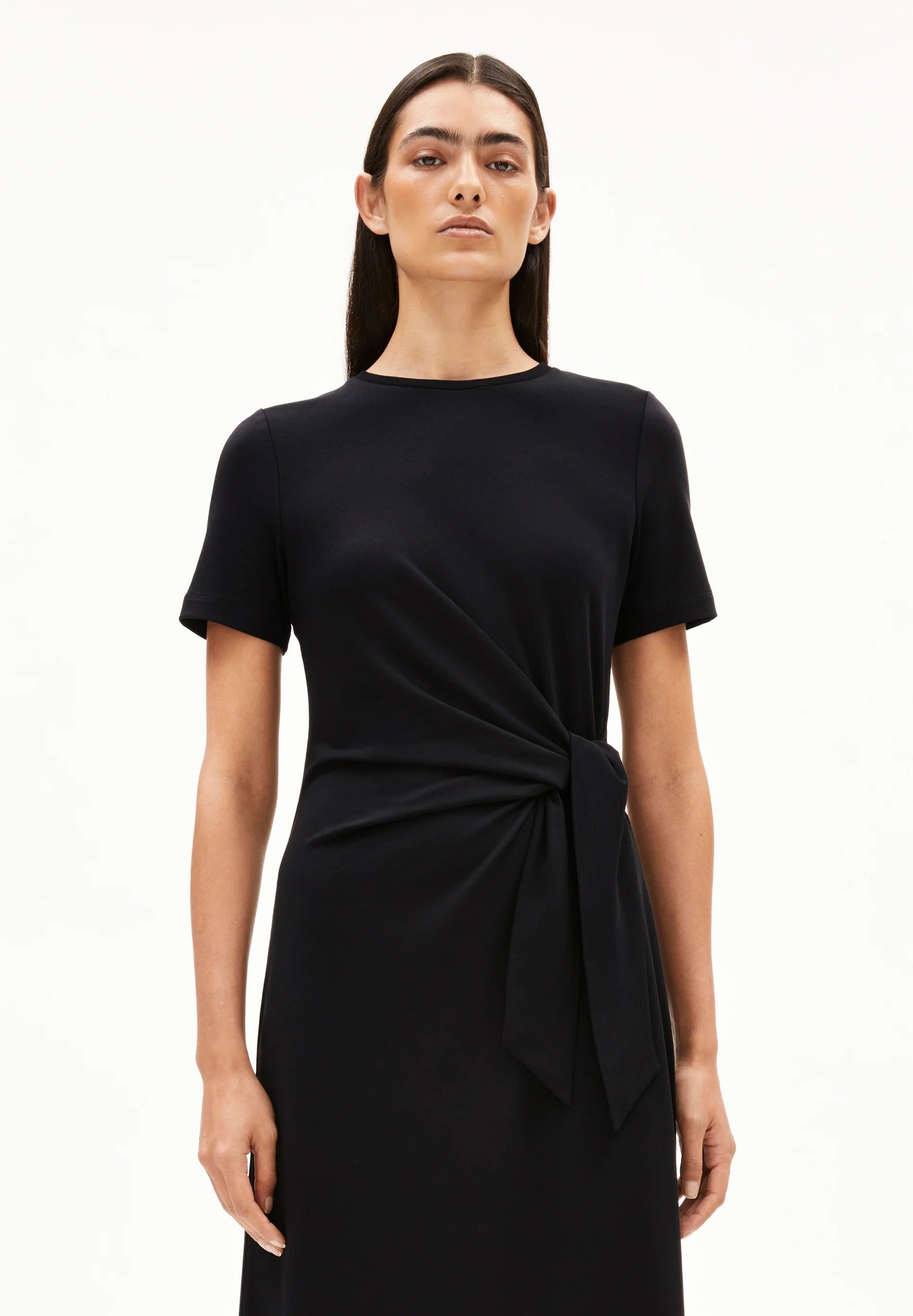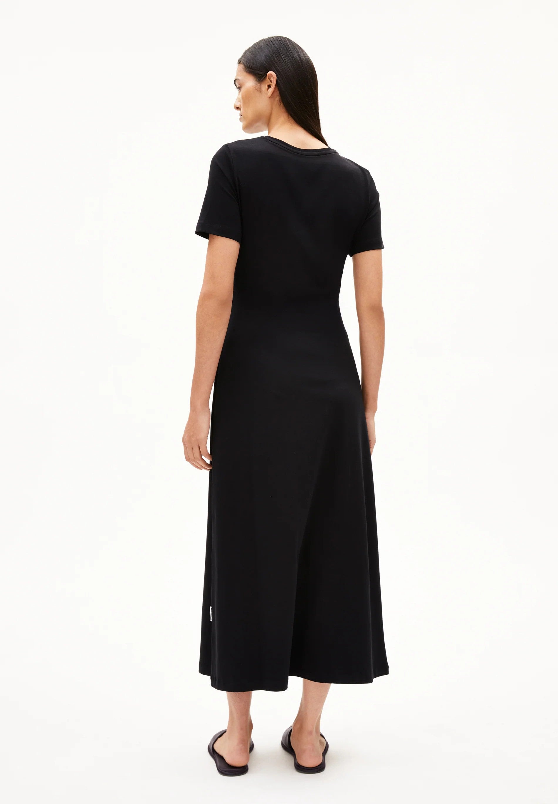 Notre robe en jersey JELTAA, confectionnée en coton biologique doux et élasthanne, présente une coupe ajustée et une longueur cheville. L'effet cache-cœur ajoute une touche distinctive au design.