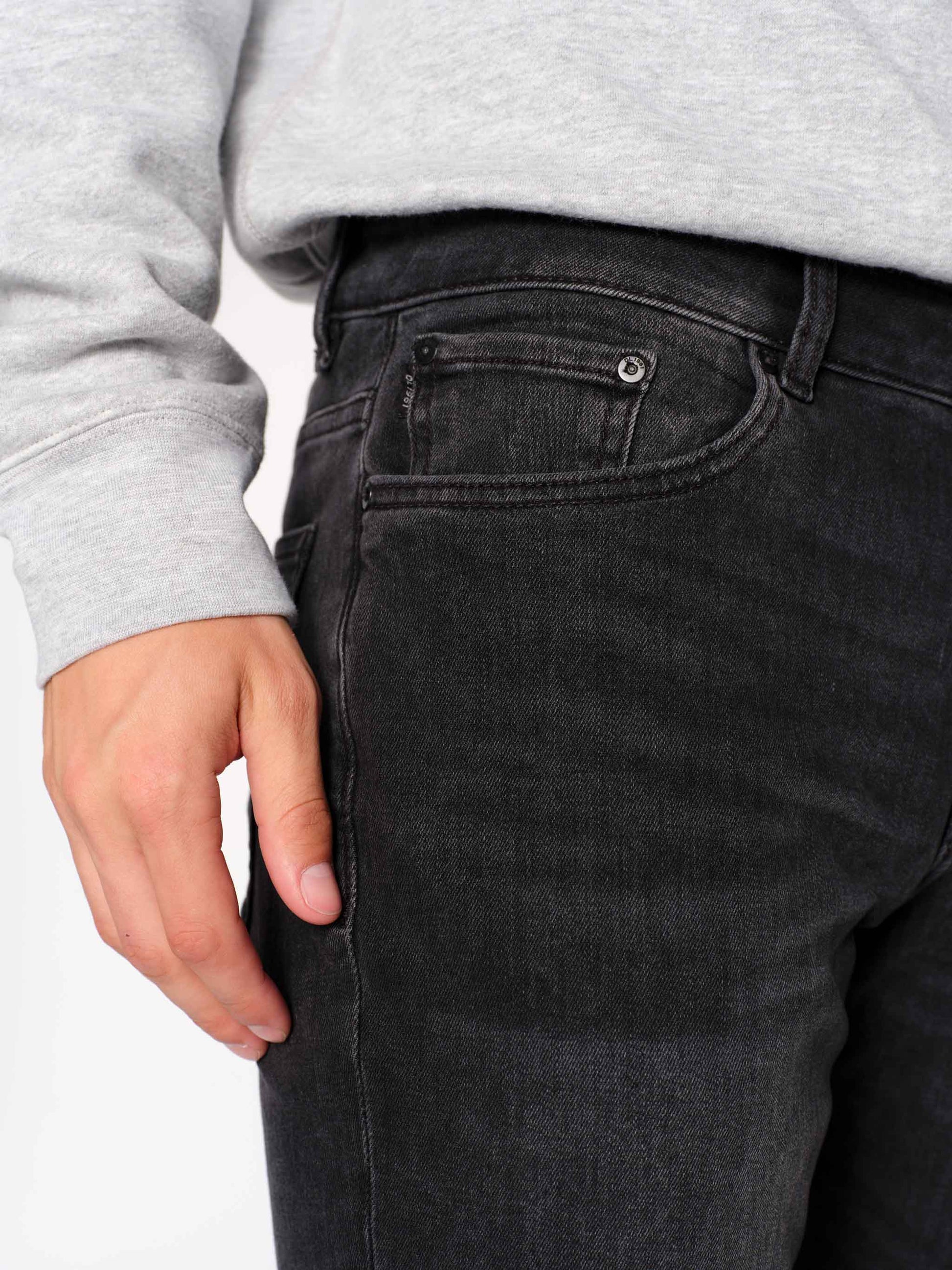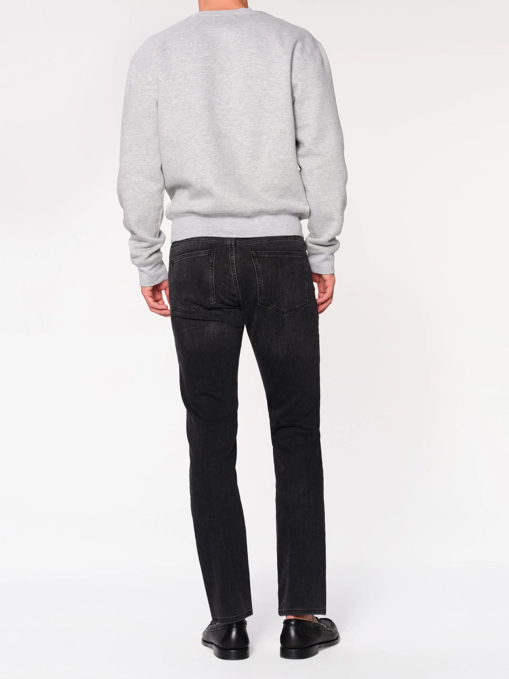 Sable est un denim noir délavé, avec de subtiles traces d'usure et des moustaches. Il est doté de détails métalliques en oxyde noir, de coutures ton sur ton, d'un ourlet net et d'un patch noir à l'arrière.