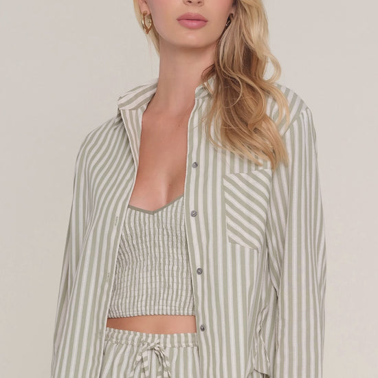 Le Davi Three Piece est confectionné dans un tissu rayé en coton et facilite l'habillage. Il se compose d'un débardeur entièrement smocké, porté sous une chemise boutonnée à la coupe décontractée. Le short est doté d'une taille élastique pour un confort optimal.