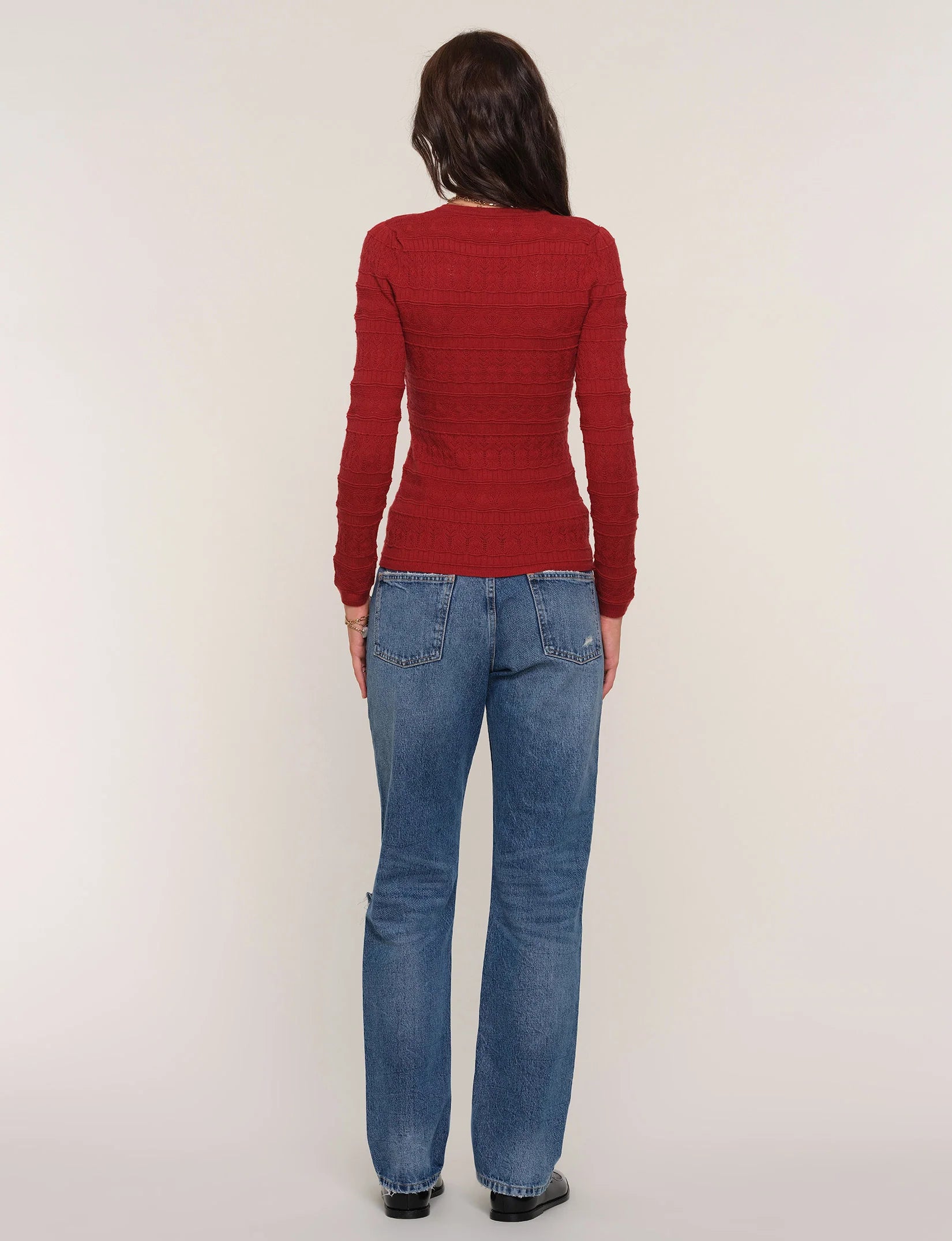 Le haut "Daisy" est confectionné dans un joli tricot pointelle. Il présente une coupe ajustée, un col rond et une patte de boutonnage Henley sur le devant. C'est un vêtement simple que vous ne quitterez plus.