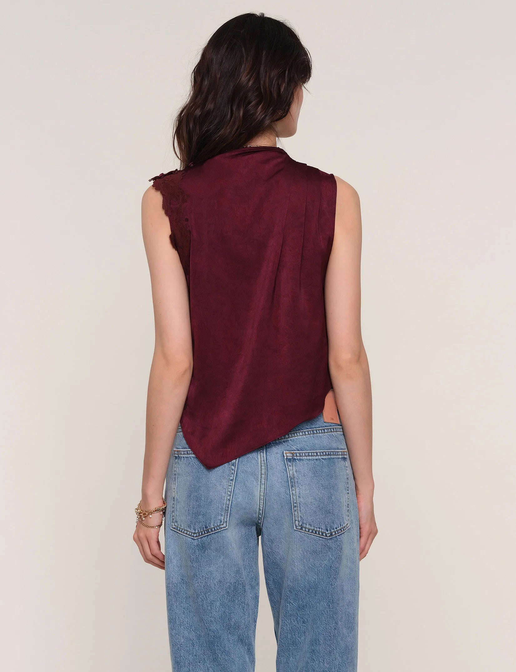 Le haut "Novia" est confectionné dans un satin martelé luxueux. Il présente une épaule drapée qui tombe en un ourlet asymétrique. Il est orné d'une jolie dentelle sur le côté gauche.