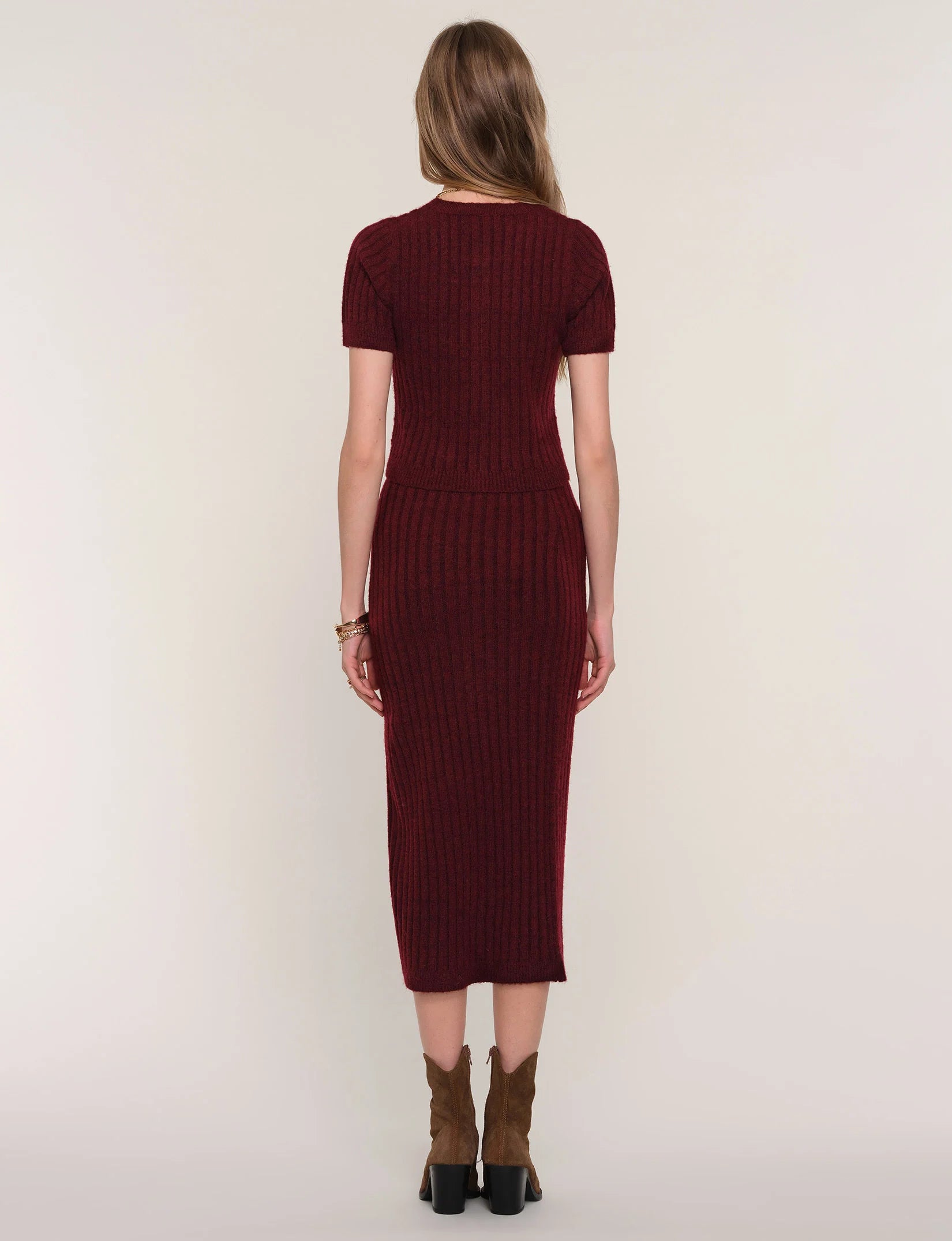 L'ensemble Carmela est une tenue complète. Il comprend un cardigan à manches courtes en tricot avec des boutons fantaisie et une jupe midi ajustée. À porter ensemble ou séparément.