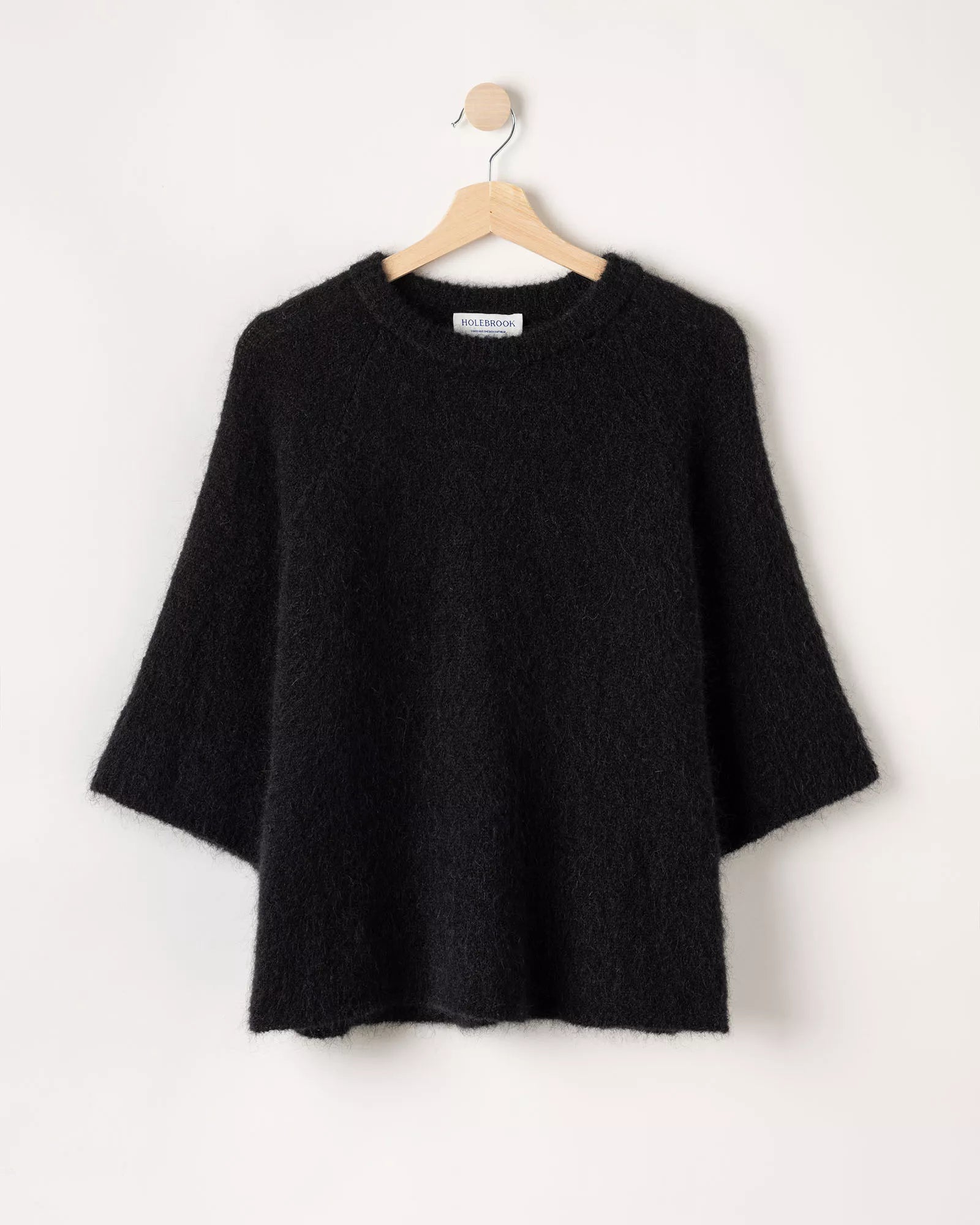 Pull en maille plate en mohair kid moelleux, col rond et coupe carrée. Manches raglan arrivant juste en dessous du coude. À porter avec la jupe Tindra et les accessoires Sturkö de même qualité. Le fil est certifié selon les normes Responsible Mohair Standard (RMS) et Global Recycled Standard (GRS). Fabriqué de manière durable en Europe.