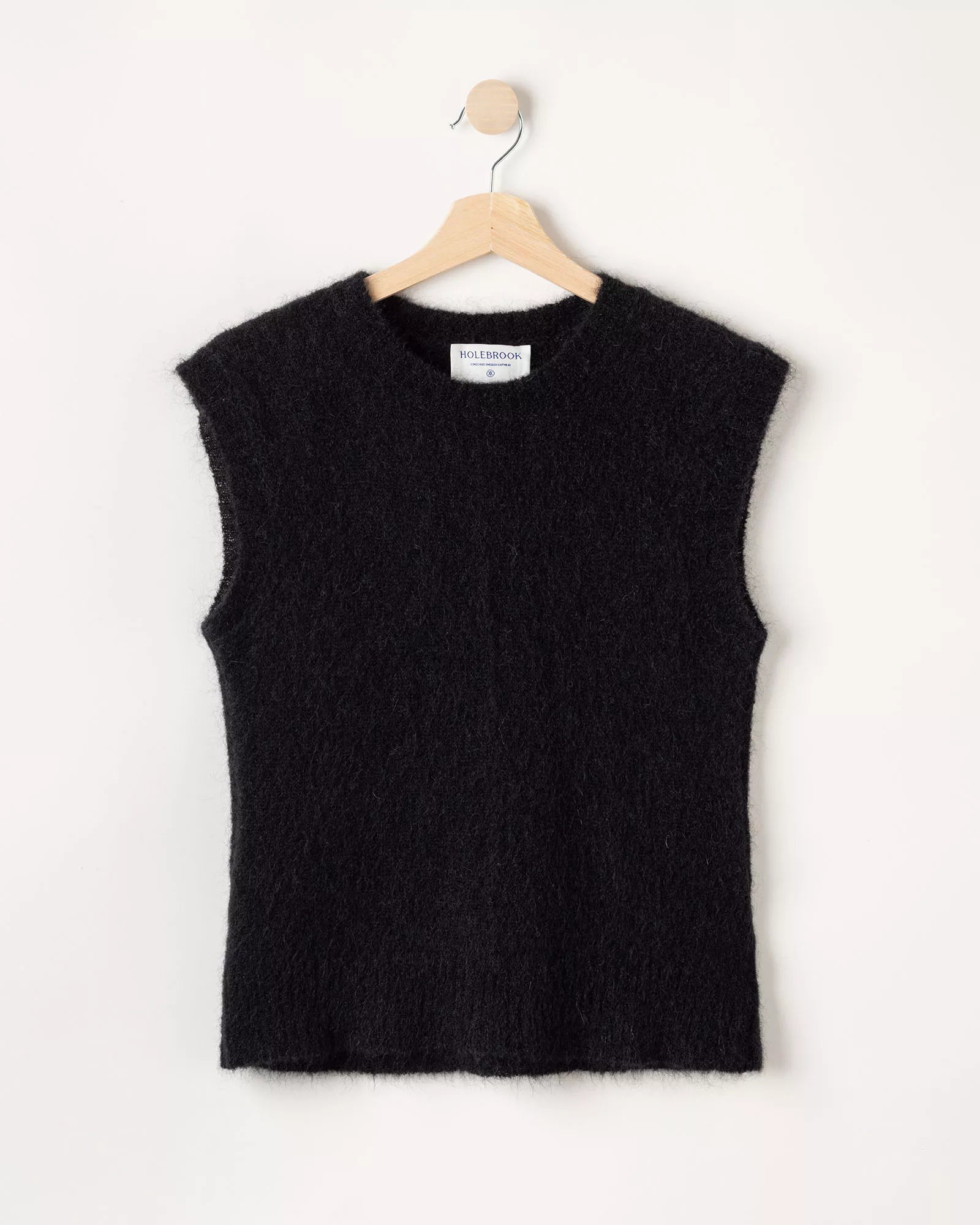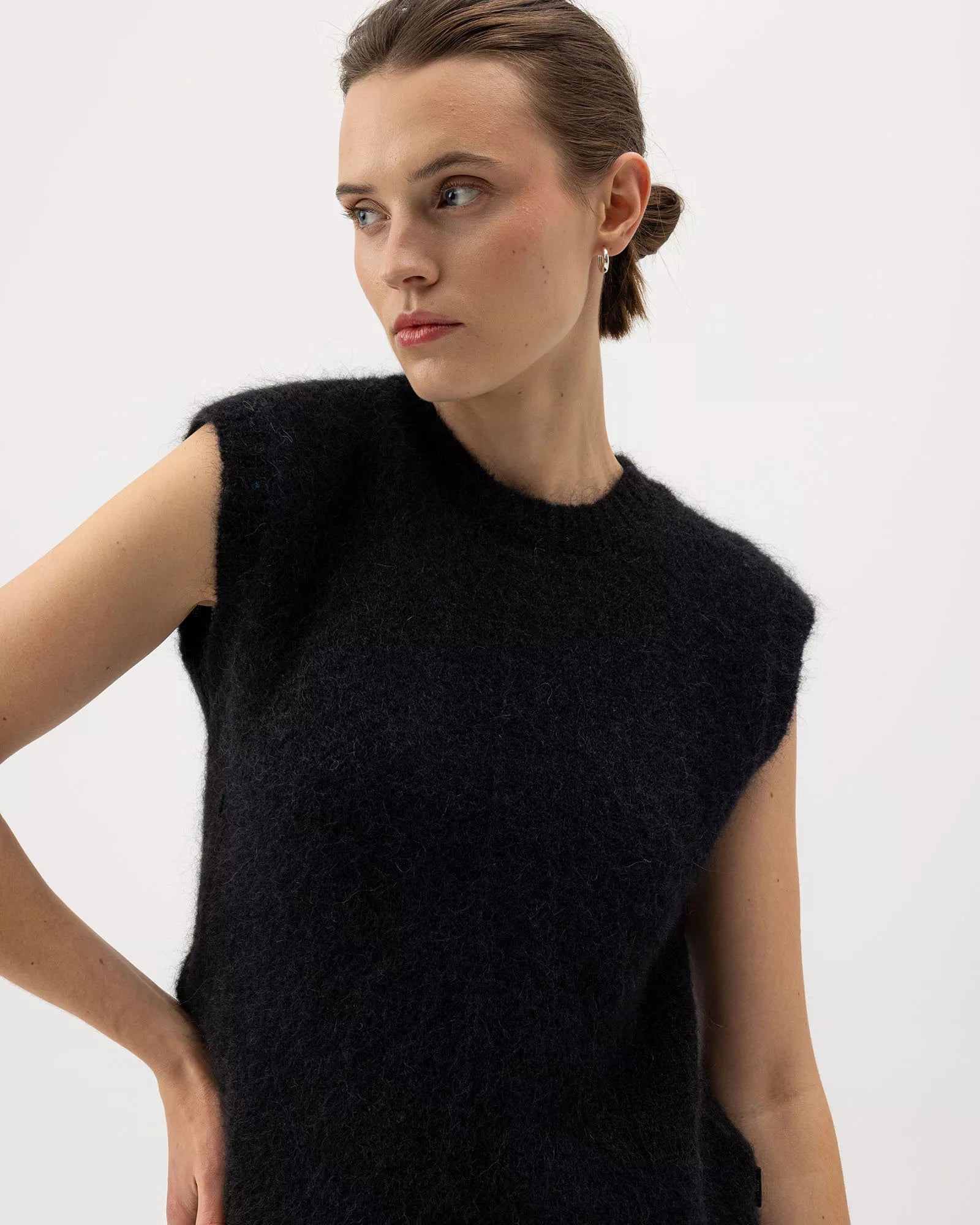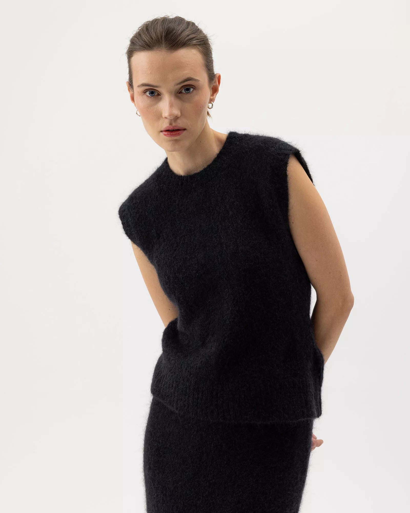 Haut/gilet sans manches en maille plate, en mohair kid doux et moelleux. Bordures côtelées et coupe régulière. À associer avec la jupe Tindra ou le cardigan Tindra pour un ensemble assorti. Le fil est certifié selon les normes Responsible Mohair Standard (RMS) et Global Recycled Standard (GRS). Produit de manière durable en Europe.