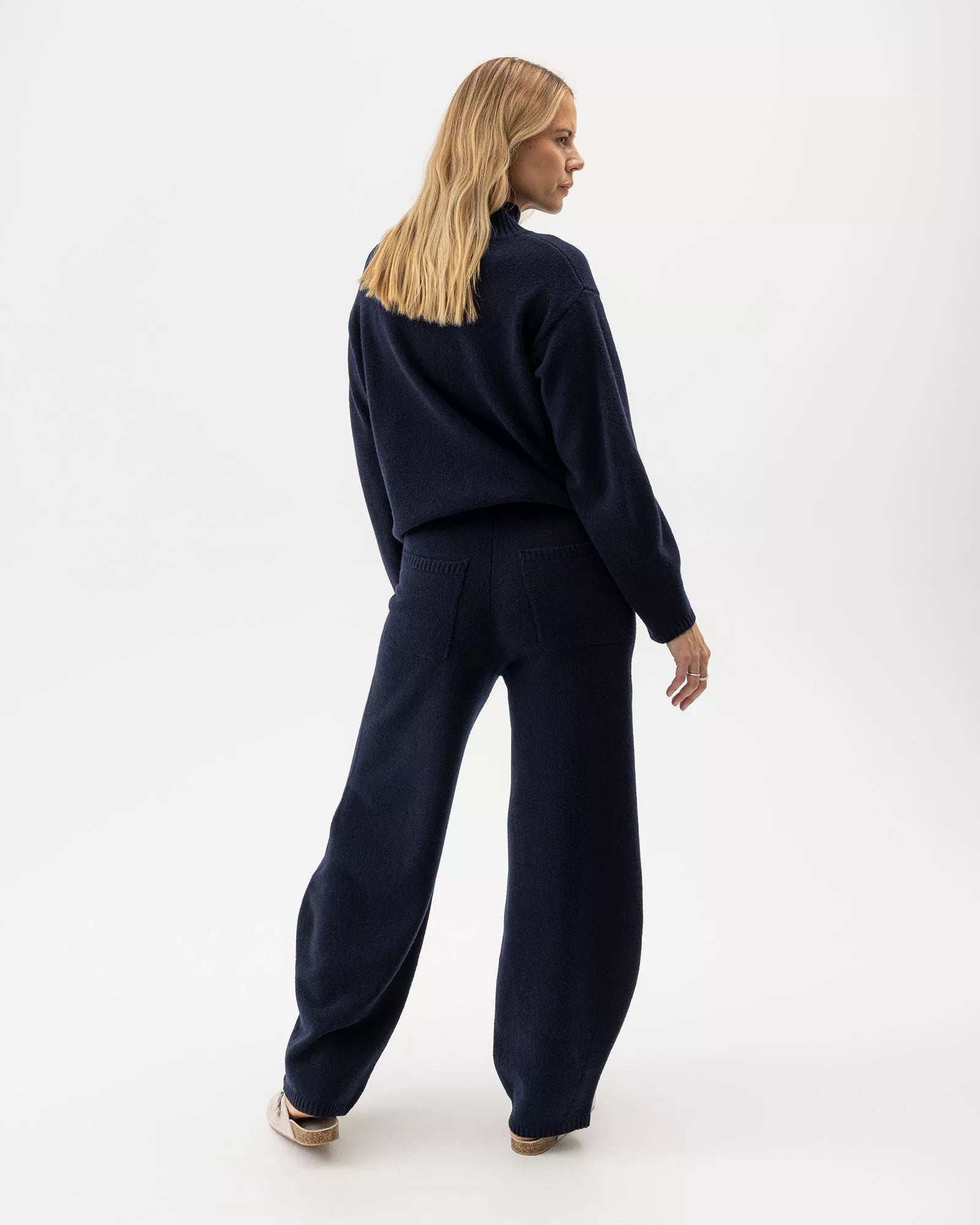 Pantalon en maille plate en laine mélangée avec taille élastique. Coupe décontractée et poches plaquées à l'arrière. Jambes longues avec ourlets arrondis. Ourlet côtelé. À associer avec le pull Veronika Turtle pour un ensemble élégant. Fabriqué de manière durable en Europe.