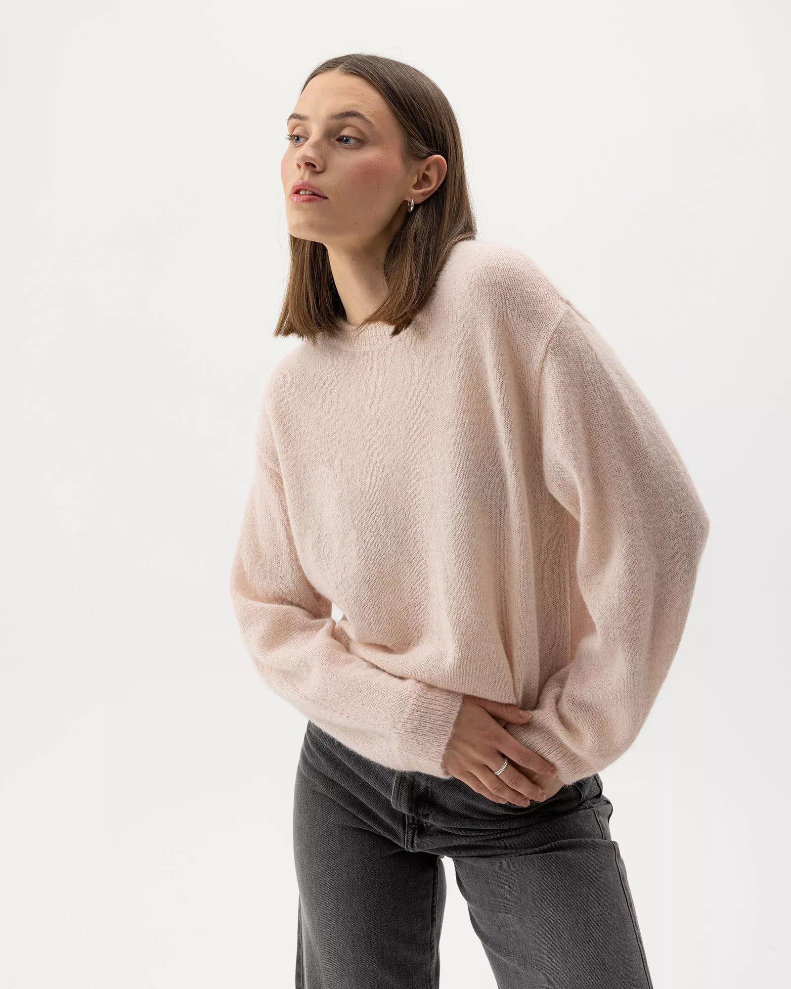 Pull à col rond tricoté dans un mélange de laine d'alpaga doux et aéré. Coupe décontractée avec épaules légèrement tombantes. Poignets et ourlet côtelés. Le fil est certifié GRS, ce qui signifie qu'il contient un pourcentage minimum plus élevé (50 %) de matières recyclées et qu'il répond à des exigences sociales et environnementales supplémentaires en matière de traitement et d'utilisation de produits chimiques. Fabriqué de manière durable en Europe.