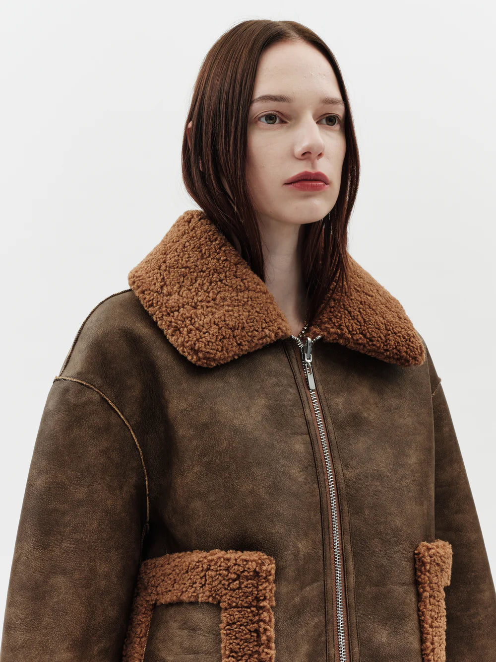 La veste Vera est entièrement réversible, dévoilant soit une doublure en fausse peau de mouton moelleuse, soit un extérieur en simili cuir élégant. Elle présente une coupe droite et carrée, une fermeture à glissière double et des poches extérieures des deux côtés.