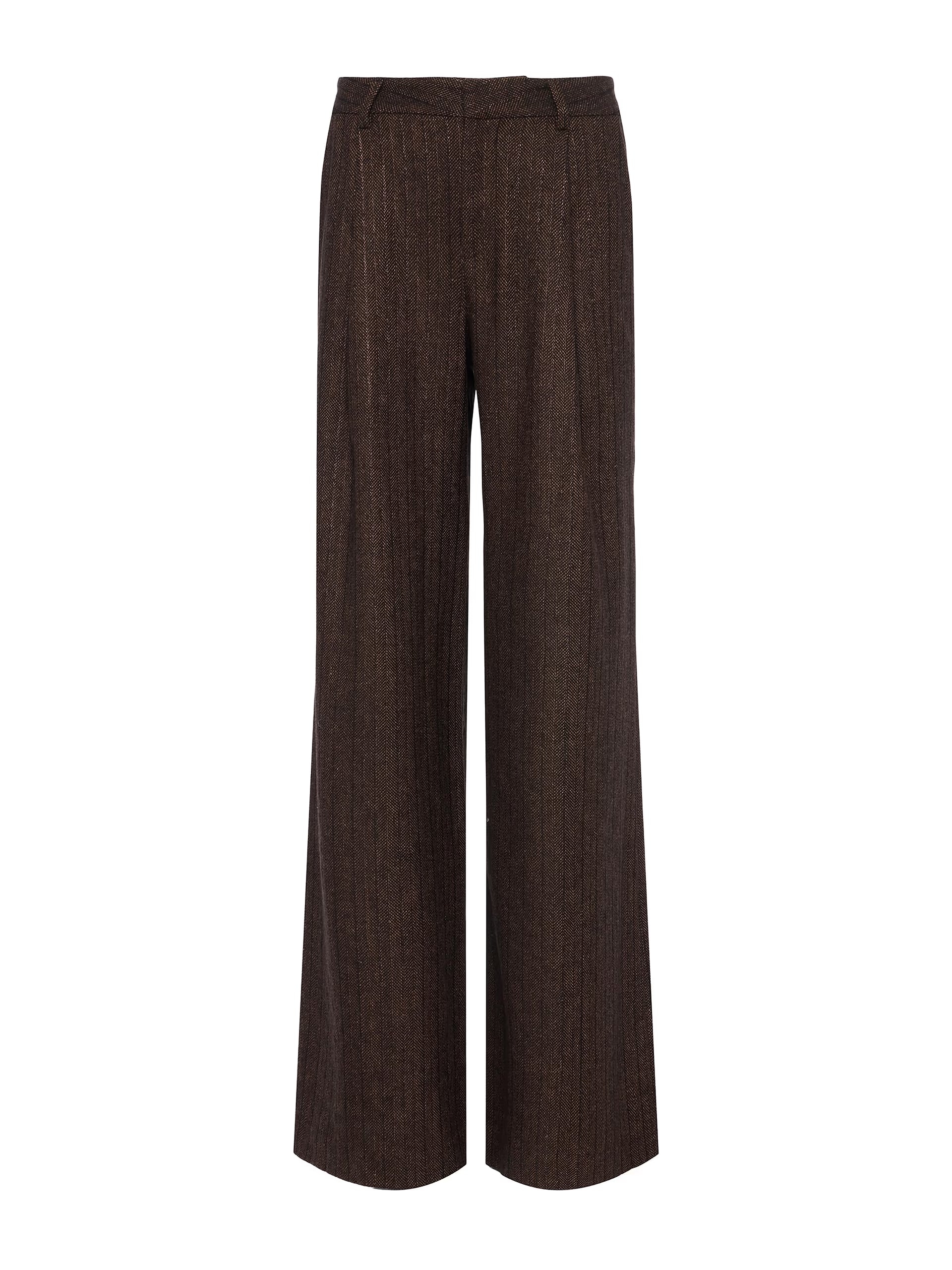 Ajusté au niveau des hanches et ample au niveau des jambes, le pantalon Allanah est un modèle moderne et raffiné à la coupe flatteuse. Il est désormais disponible en laine mélangée recyclée à chevrons avec des rayures lurex.