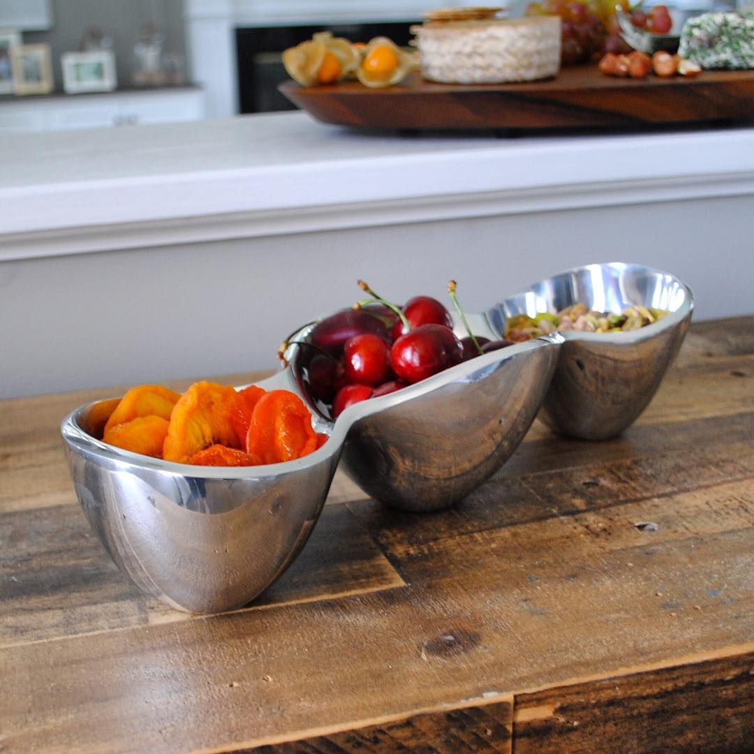Le triple serveur à condiments est un moyen pratique et élégant de présenter et de faire passer un trio de garnitures ou de sauces. L'intérieur est poli comme un miroir pour une brillance éclatante. C'est également un excellent moyen d'exposer des trésors naturels tels que des fleurs séchées, des coquillages, etc.