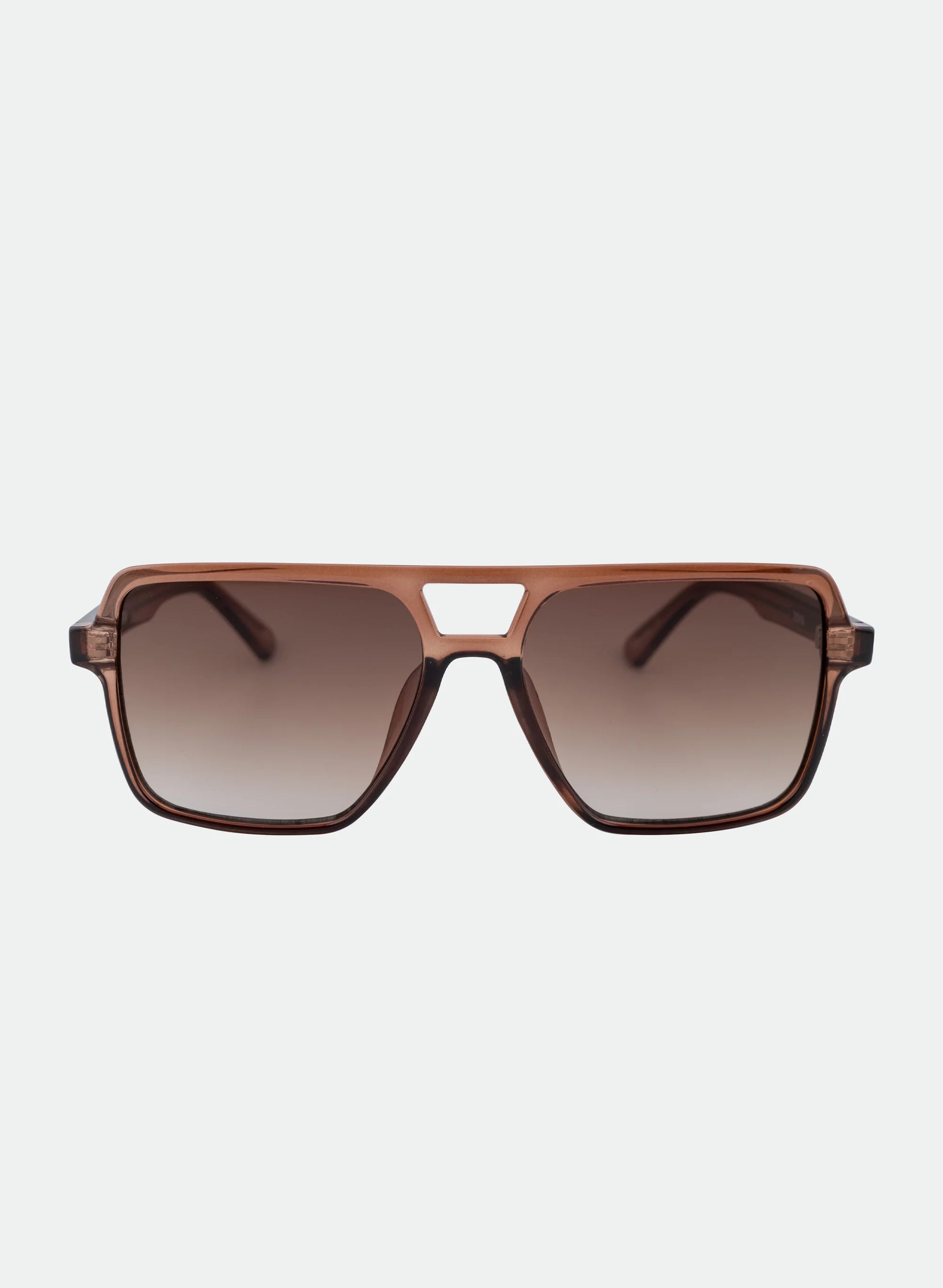 Affirmez votre style avec Zoya, une paire de lunettes de soleil aviateur carrées oversize, dotées d'une monture légèrement structurée dans une couleur érable transparente et chaleureuse. Conçues avec des verres bruns dégradés.