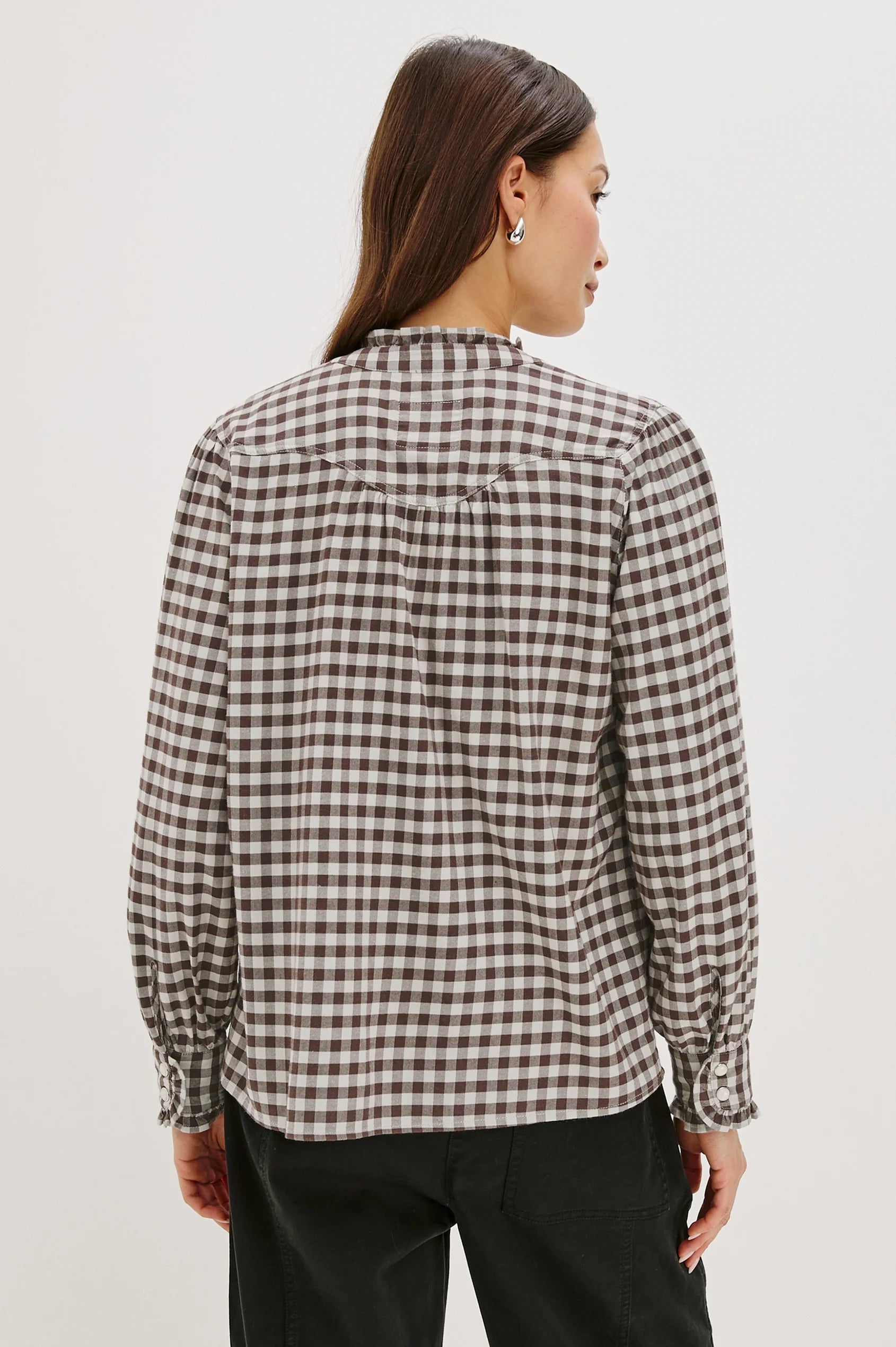 La blouse Alanna est une blouse légère en coton brossé qui allie confort et détails raffinés. Son empiècement incurvé, son col à volants et ses boutons-pression marbrés rappellent le style western.