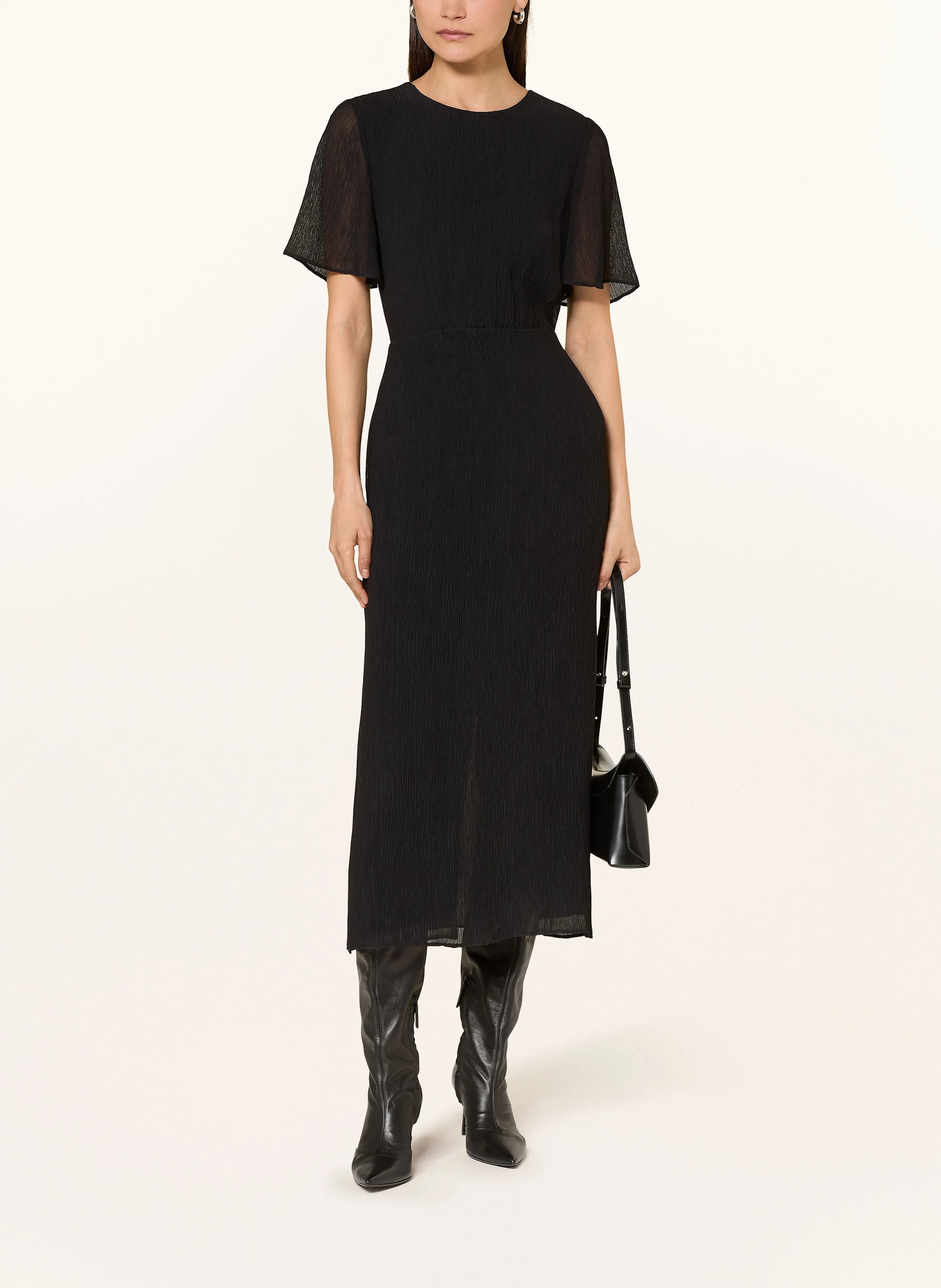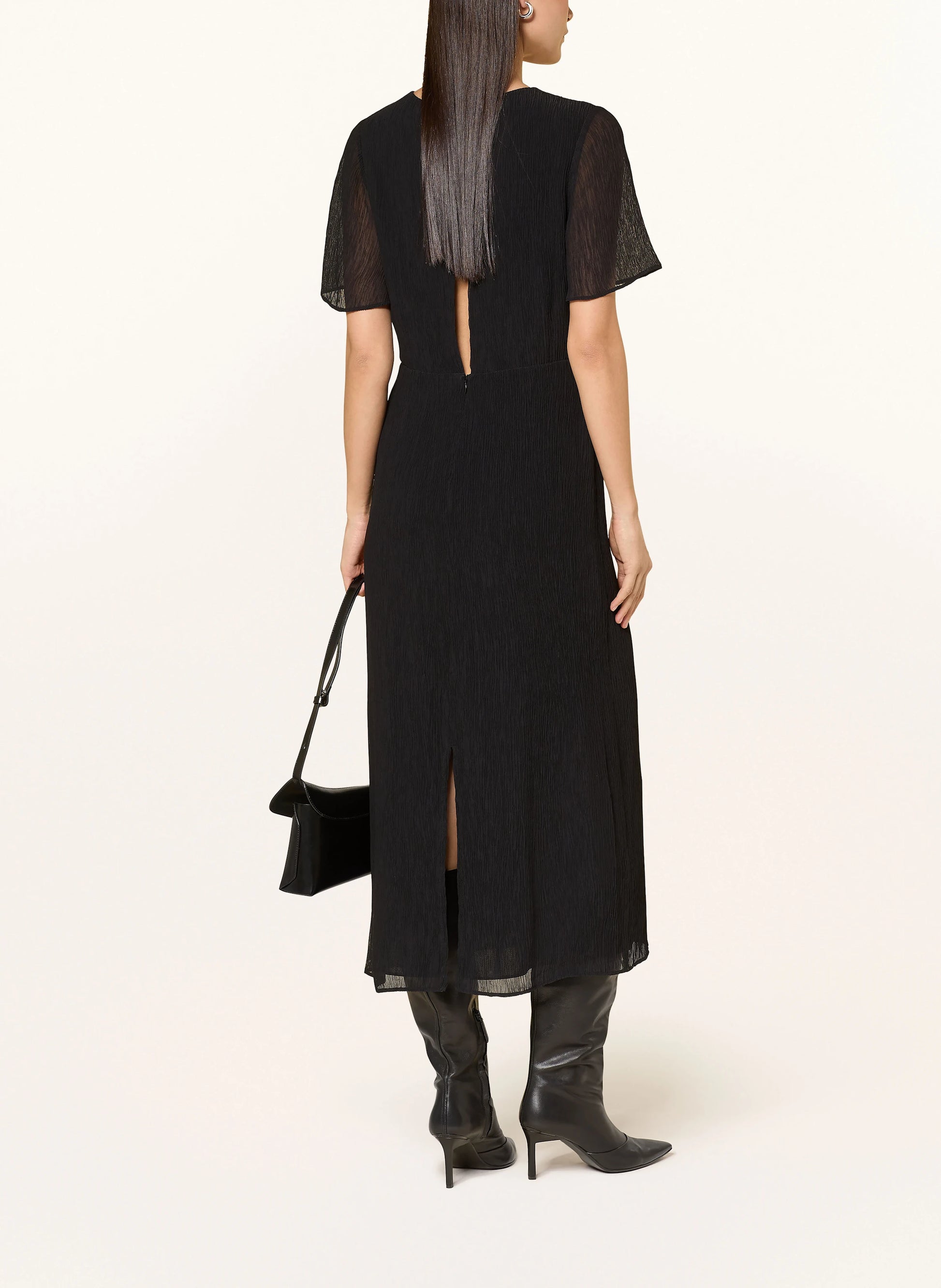 Robe longue à manches courtes et coupe classique. Fermeture à boucle élastique et bouton dans le dos, fermeture à glissière dissimulée sur le côté. Fente à l'ourlet arrière. Corps doublé, manches transparentes. Matière principale 100 % viscose recyclée.