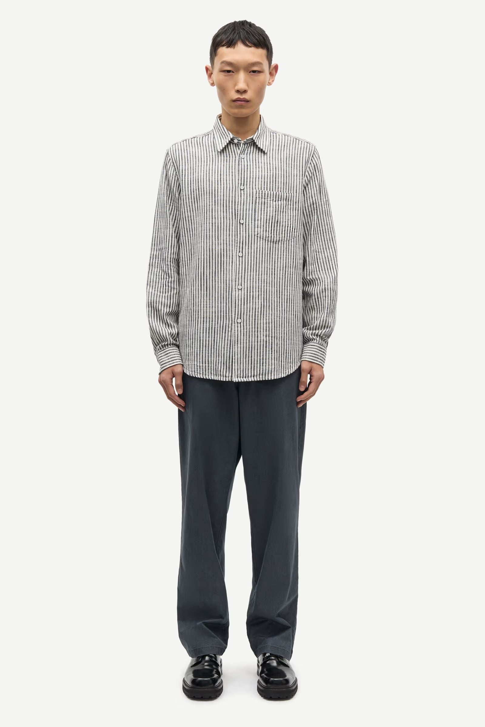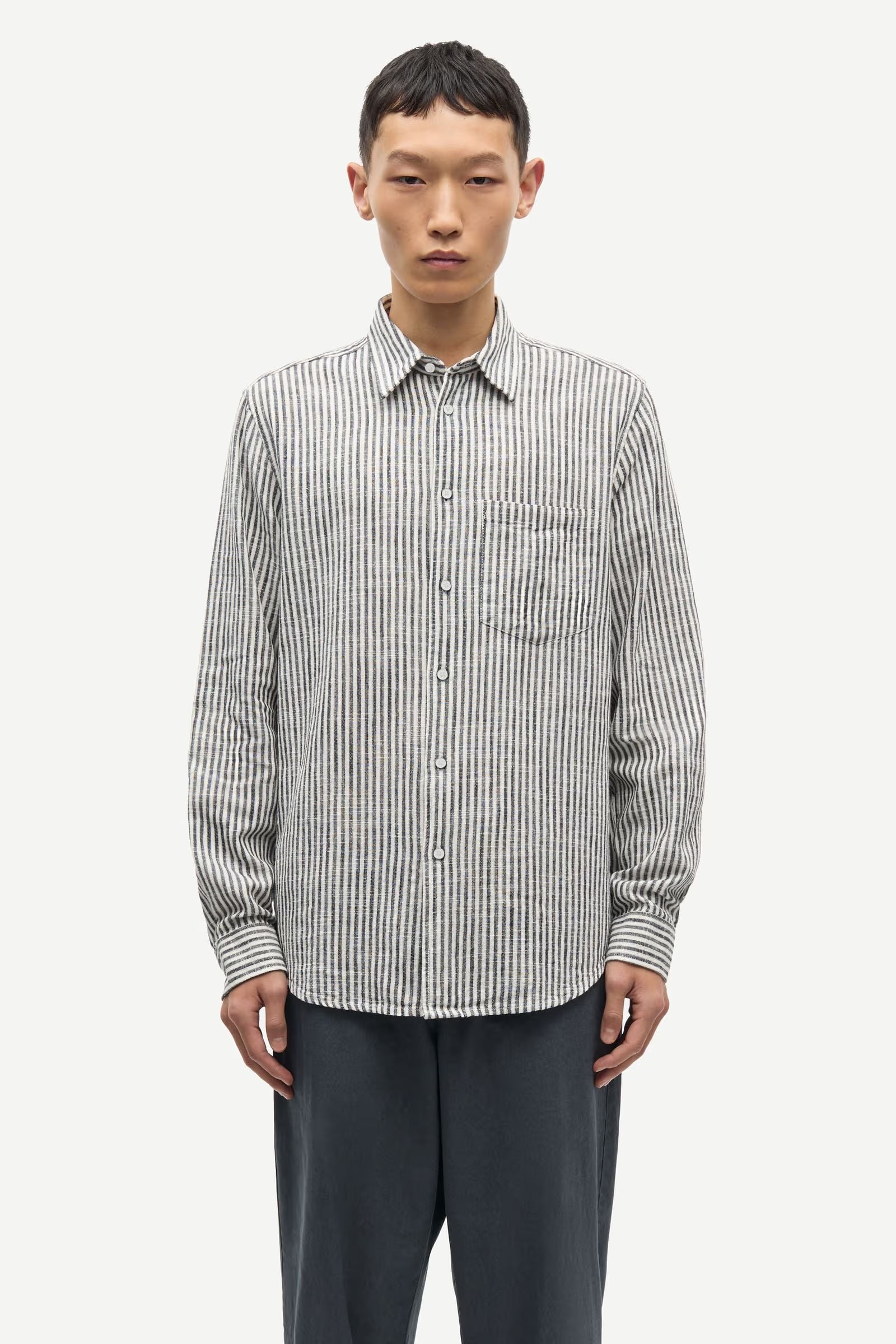 Chemise rayée à manches longues, coupe classique. Poche de poitrine, ourlet arrondi, empiècement dos avec pli plat. Tissu en coton et lin mélangé avec rayures tissées.