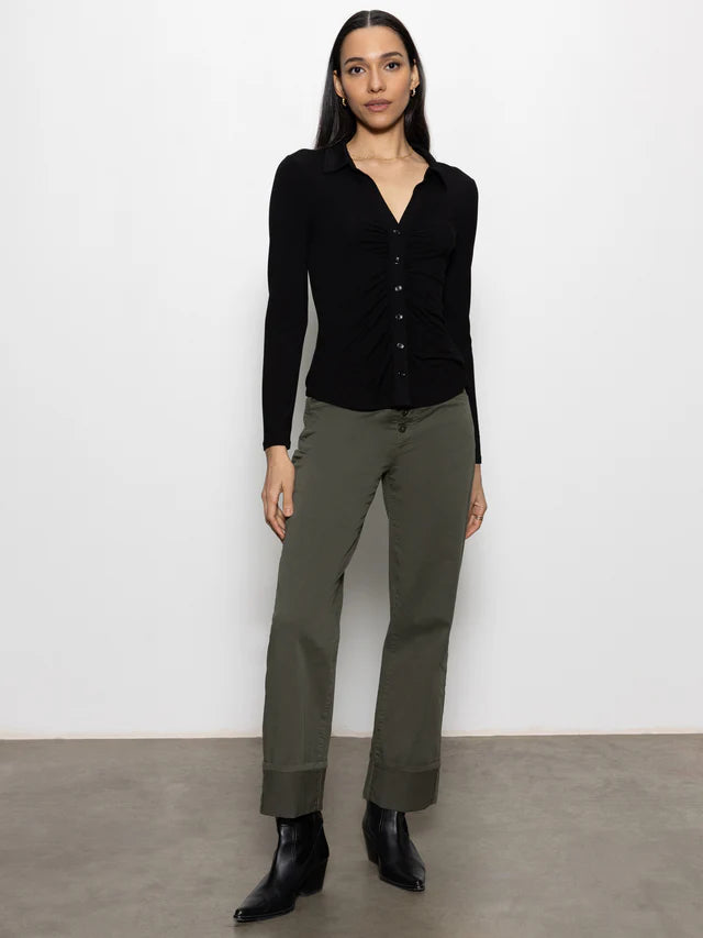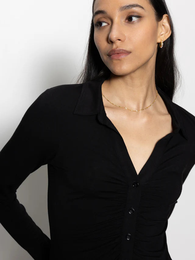 Une maille légère et fluide façonne ce chemisier fin à boutons, avec un V profond et des détails froncés sur le devant.