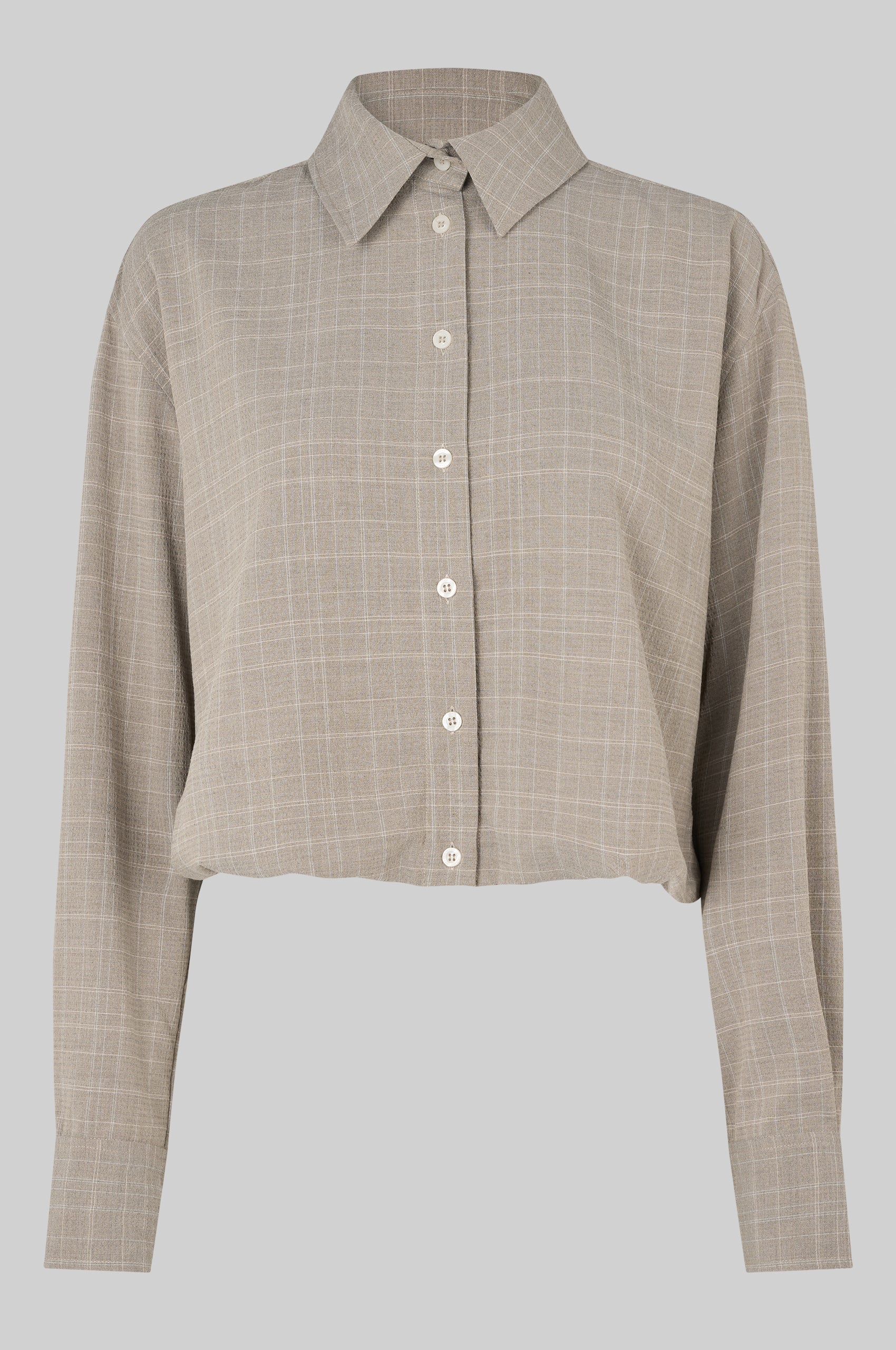 Chemise courte Second Female. Cette chemise est confectionnée dans un tissu léger et lisse, légèrement texturé. Elle présente un col classique et une fermeture boutonnée. Manches longues avec poignets boutonnés. Ourlet ballon dans le bas. Coupe courte et décontractée.