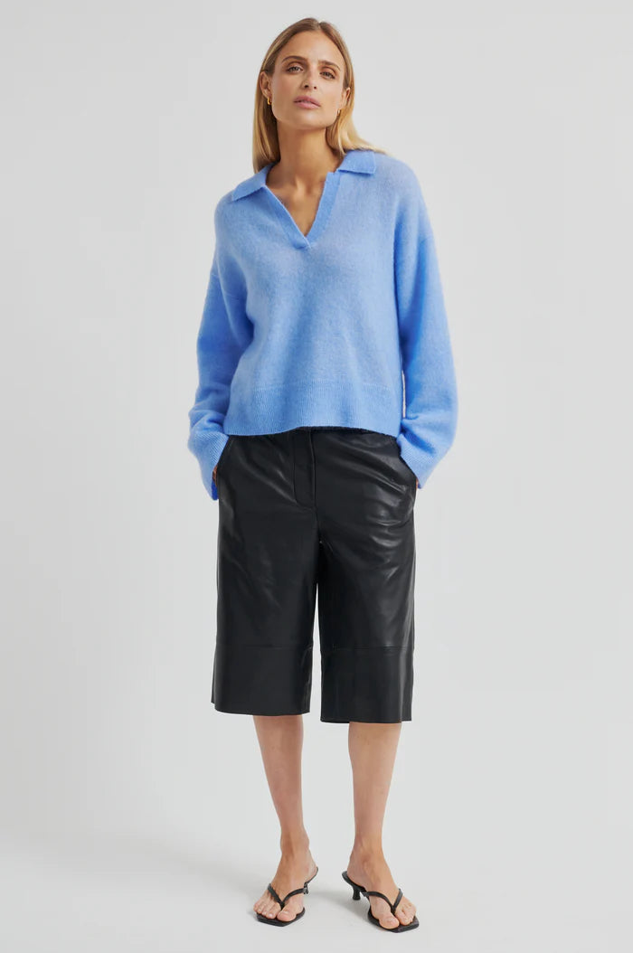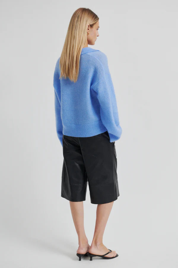 Pull Second Female à col. Ce pull est confectionné dans un mélange doux de mohair et de laine à la texture moelleuse. Il présente un col ouvert. Col, poignets et ourlet inférieur côtelés. Épaules tombantes et manches longues. Coupe ample et décontractée.