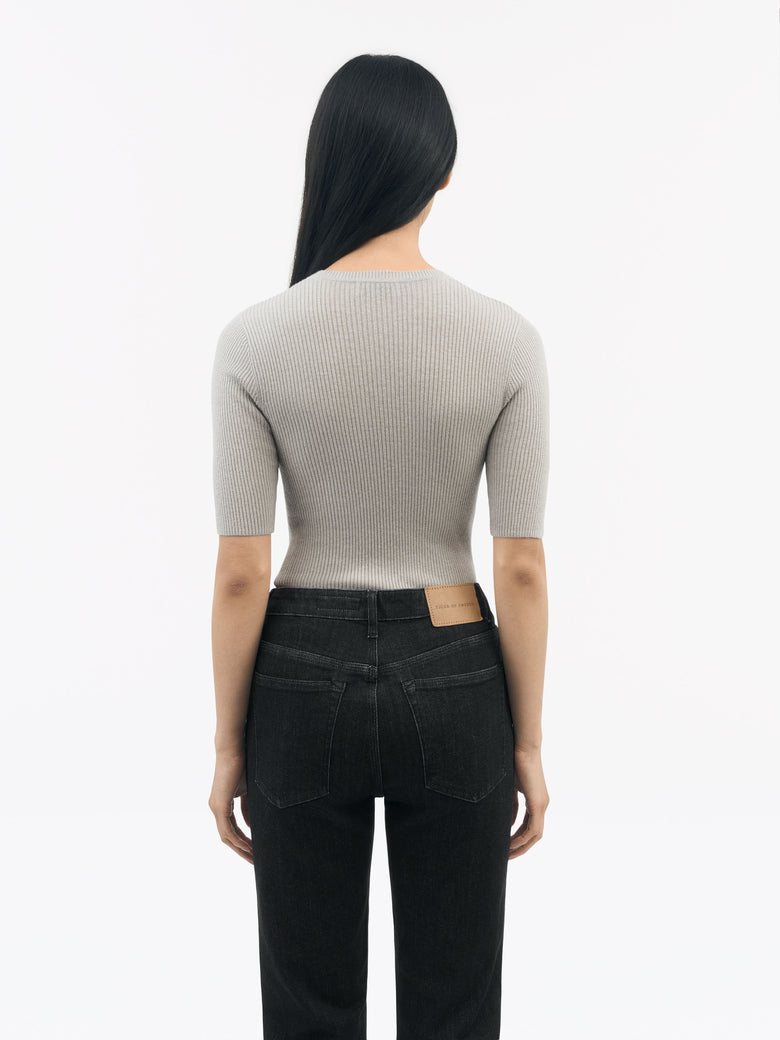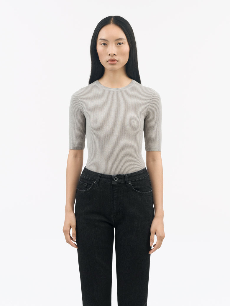 Orvi est un t-shirt ajusté à col ras du cou en mélange coton-soie finement côtelé. Ce modèle est long comme la hanche, avec des manches au coude, et est complété par des bordures à l'ourlet inférieur et aux manches.