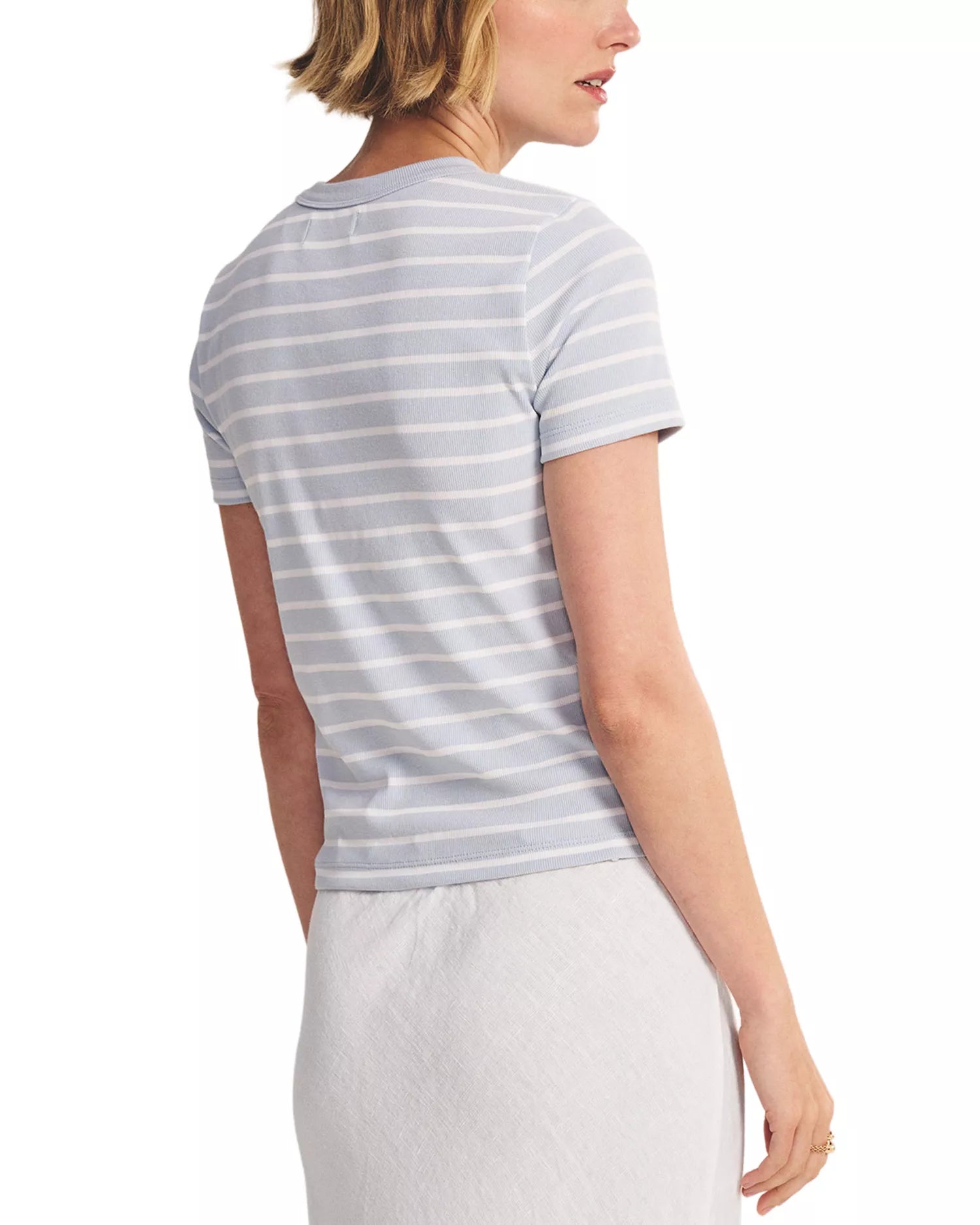 Indispensable de toute garde-robe, ce t-shirt présente une coupe courte et ajustée avec un col rond côtelé classique pour un look flatteur et épuré. Confectionné dans un mélange de coton côtelé légèrement extensible, il accompagne confortablement les mouvements du corps tout en conservant sa forme.