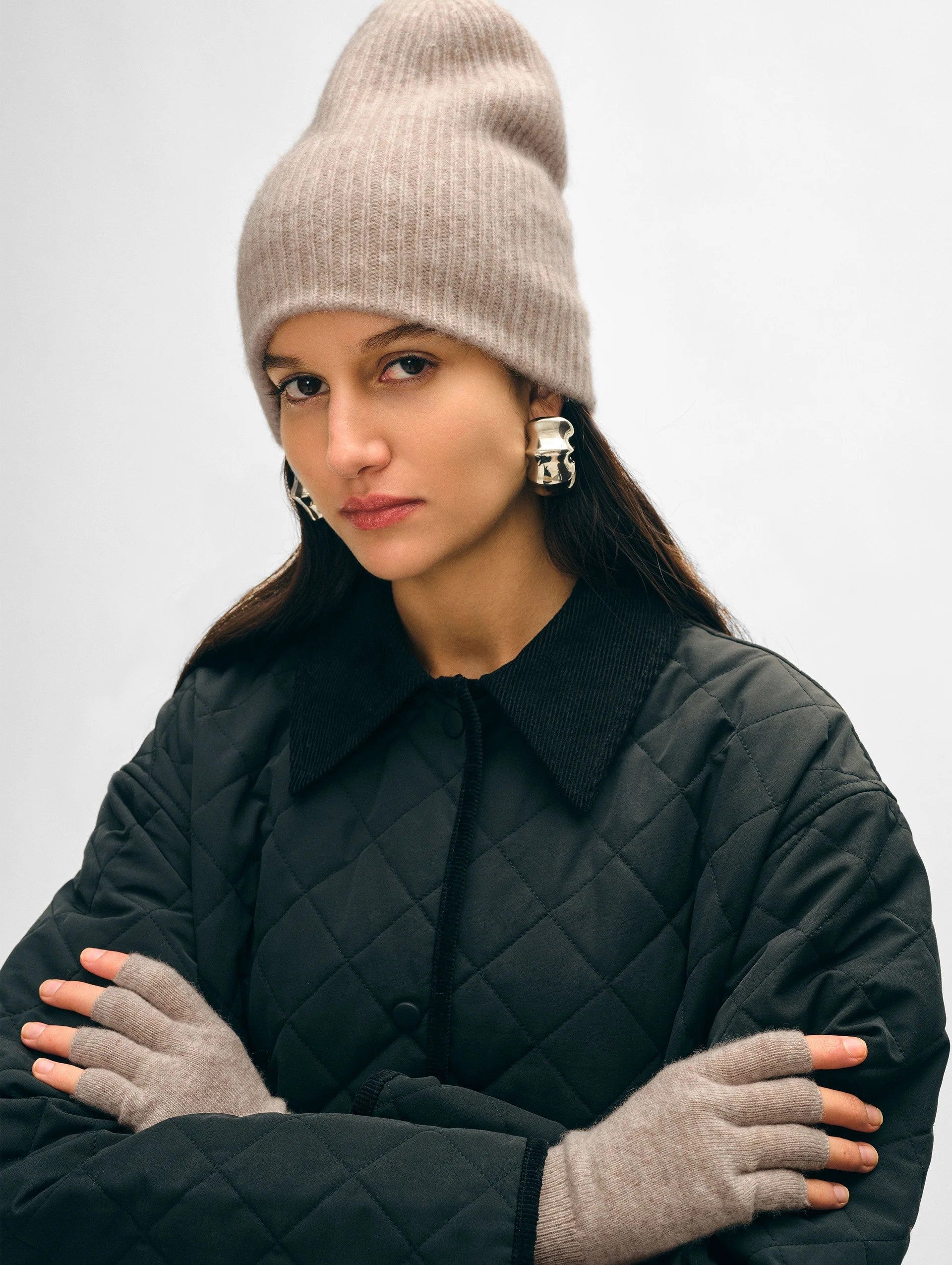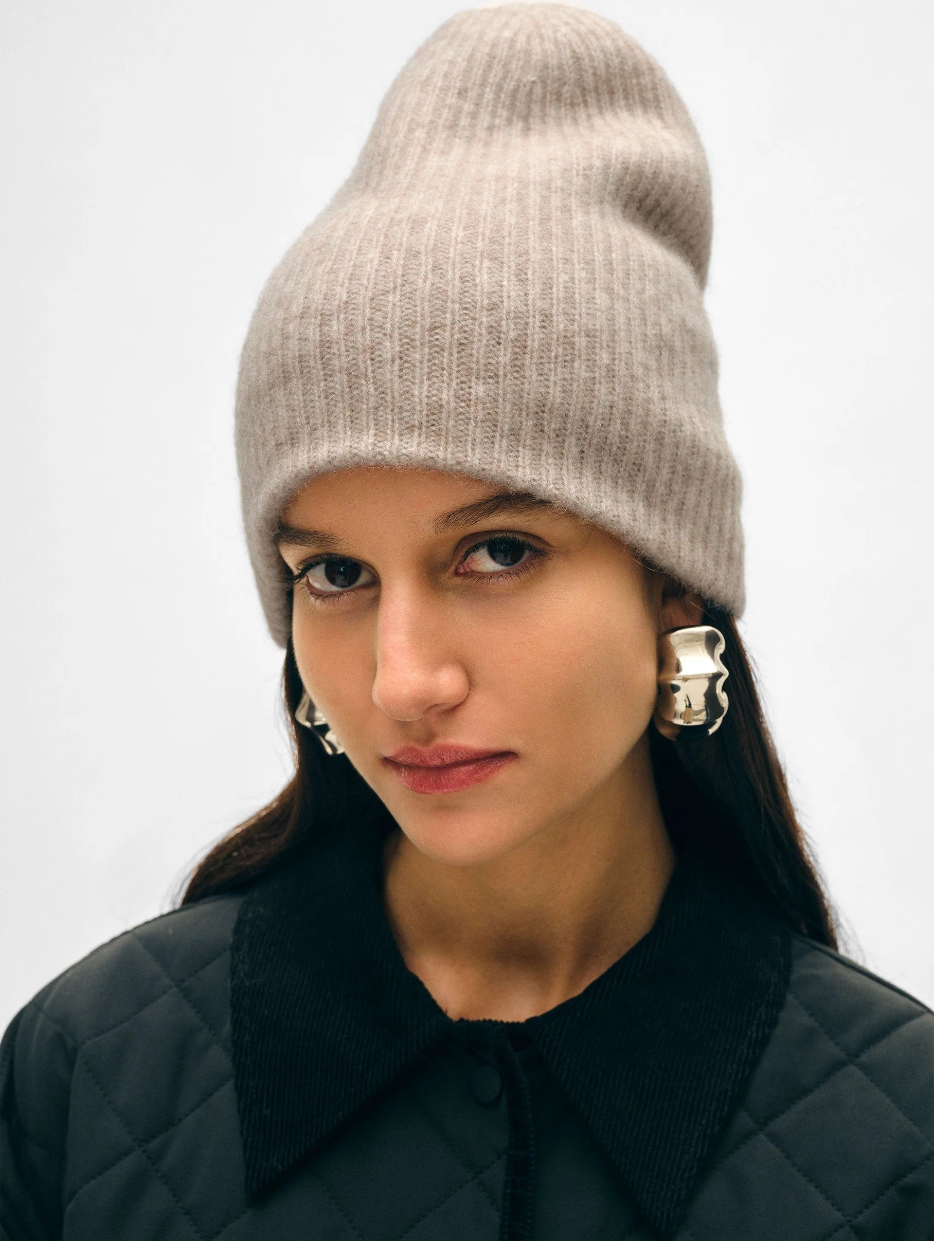 Bonnet intemporel tricoté en cachemire ultra-doux. Avec sa structure côtelée double épaisseur pour plus de chaleur et de texture, il peut être porté retroussé ou long.
